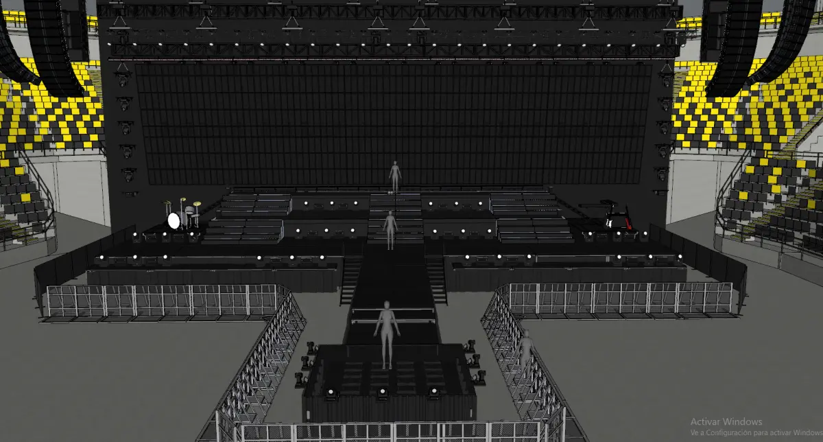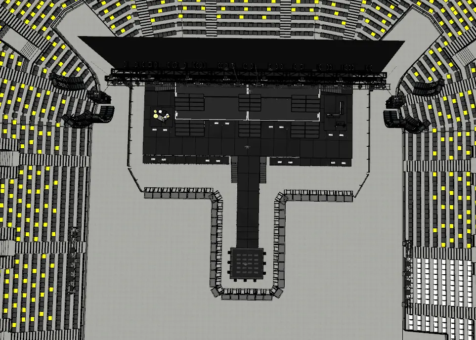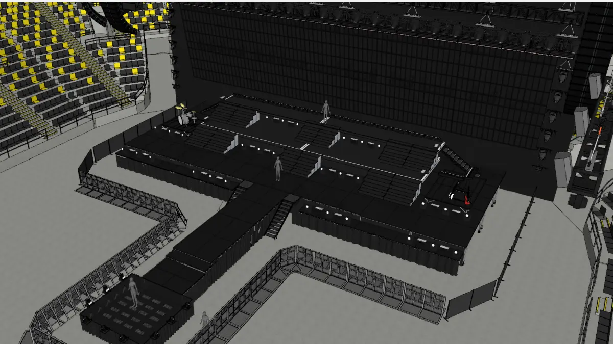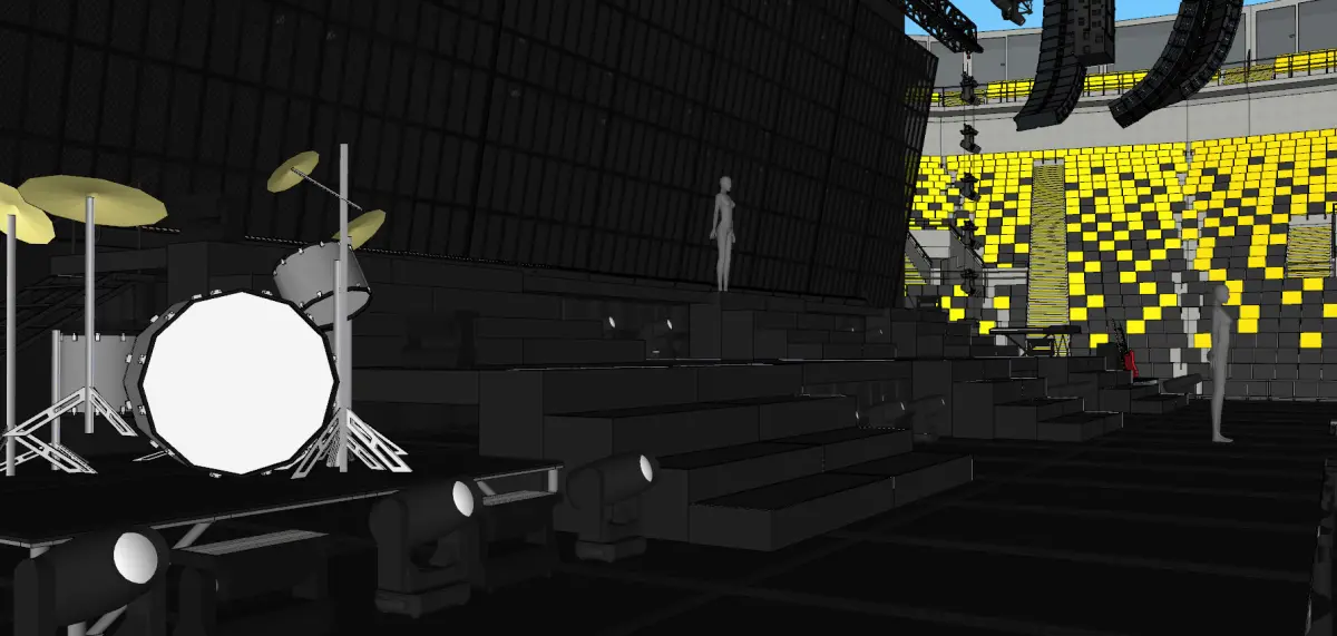 A high detail concert arena stage, with light beads and speakers angled perfectly. and with a creative scenography