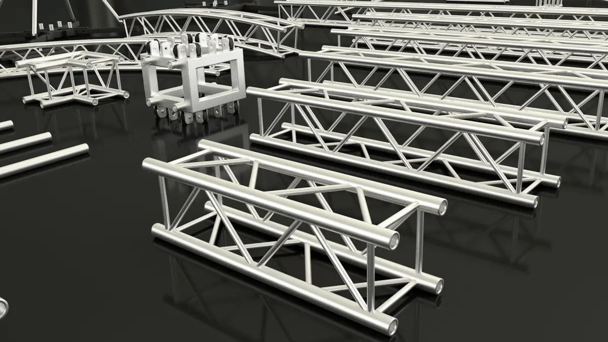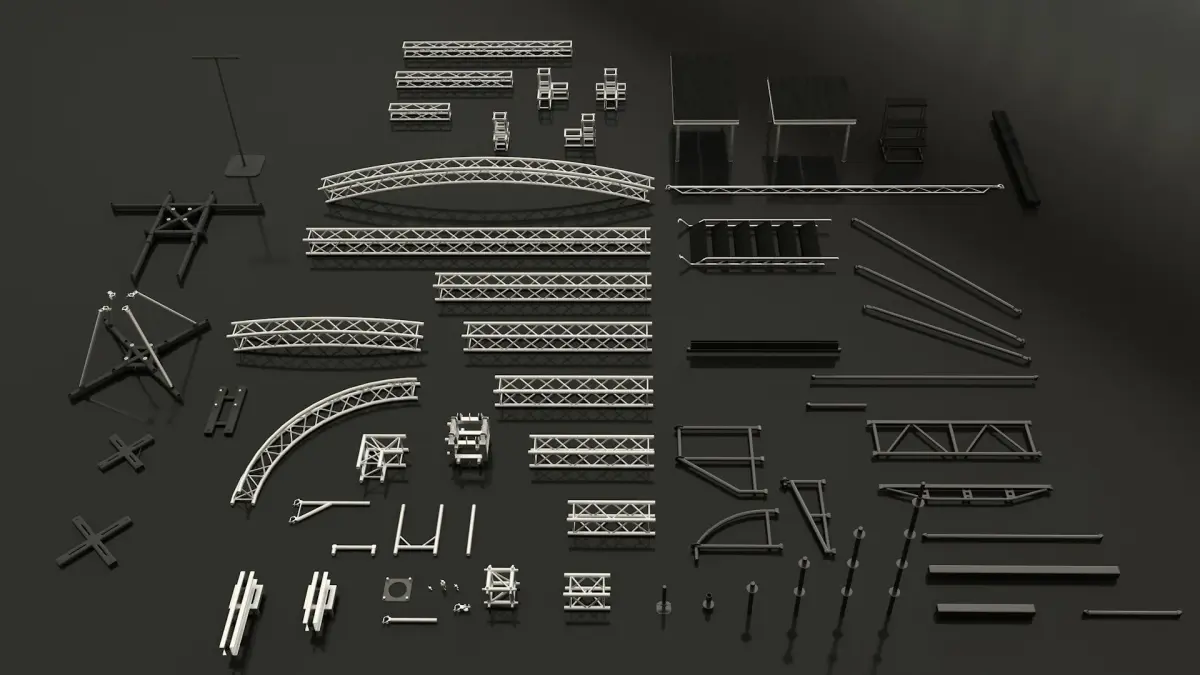 I present to you a collection of elements of stage constructions. These elements and details are needed to build stages, concert venues, and events of various scales.The collection includes aluminum trusses and steel structures such as Layher, as well as accessories to them.Aluminum trusses are available in two sizes: 300mm and 220mm. There are different sizes and different connecting elements. For aluminum trusses in the collection there are different platforms used depending on the design. There are also many accessories for aluminum structures in the form of connectors, platforms and remote tubes for easy placement of lighting fixtures.There are carriages, outriggers and hoists, as well as metal elements such as Layher.Layher parts are vertical, horizontal, diagonal elements as well as remote consoles and elements for setting and adjusting height.To build a stage mirror, there are podiums of different sizes, as well as stairs for them