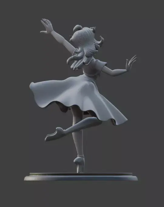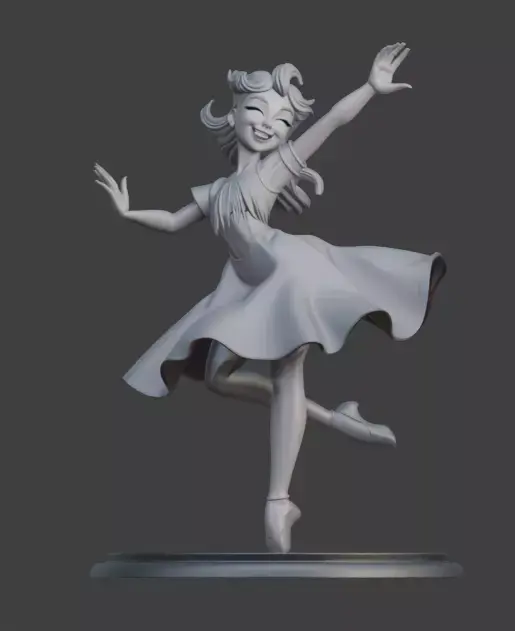 The sculpture utilizes smooth, rounded shapes and a cartoon realism aesthetic, presenting the character in a monochromatic grey material that highlights the flow of the design. She is depicted wearing a flowing dress with a feathered or fringed neckline and classic ballet-style pointe shoes. The figurine is professionally anchored to a sleek, circular display base, making it an ideal reference for digital character sculpts or physical collectible statues.