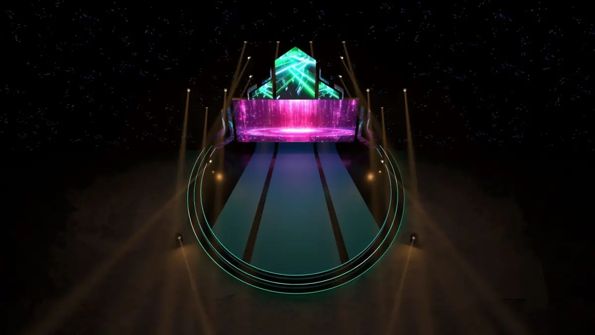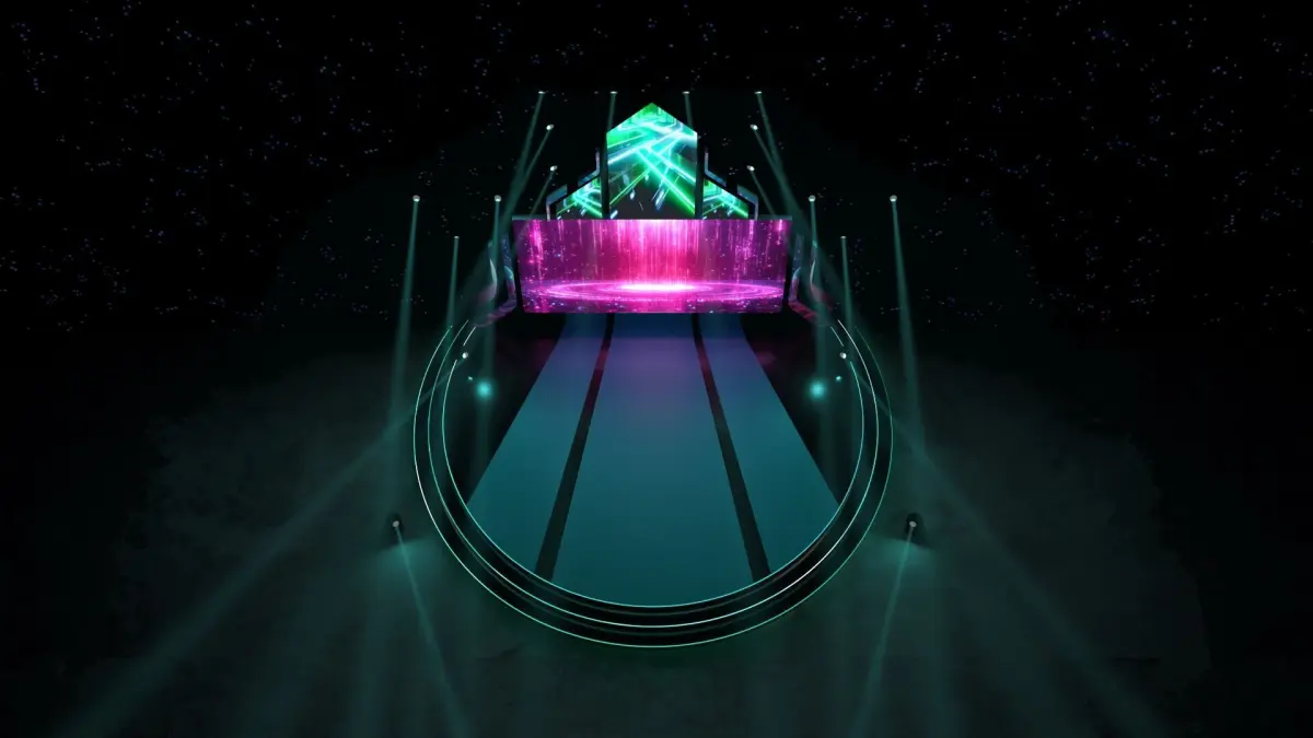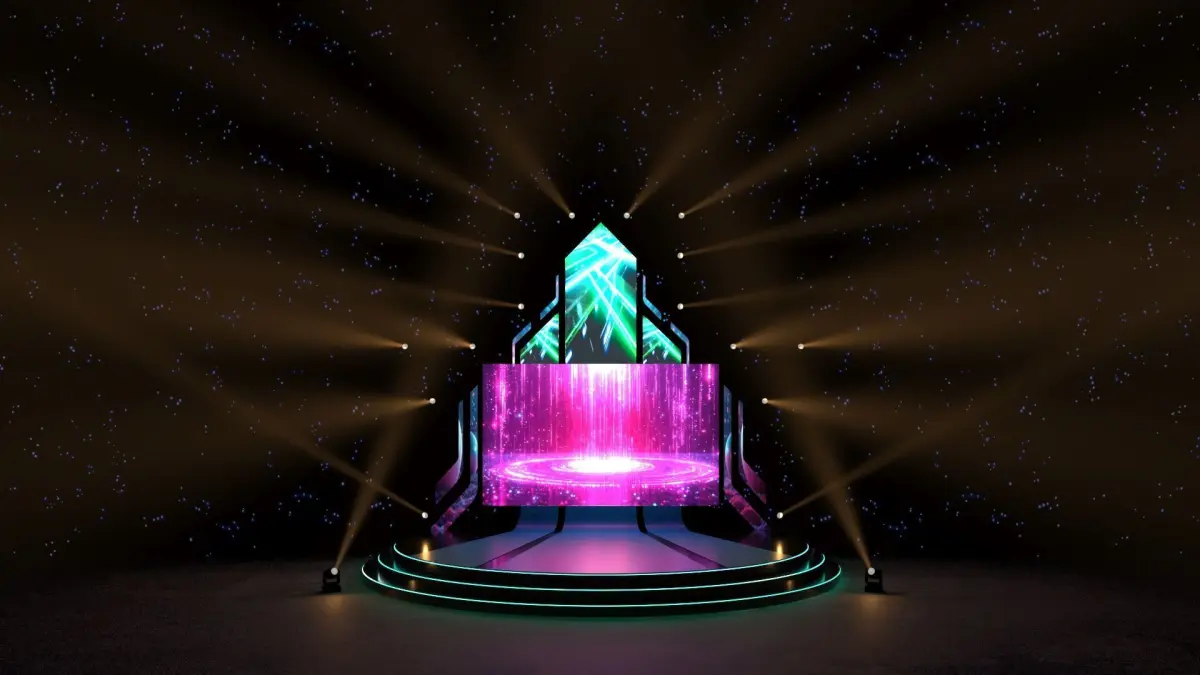 This high-quality 3D model of a futuristic LED stage features a vibrant sci-fi design, perfect for modern events, e-sports competitions, tech conferences, or digital award shows.