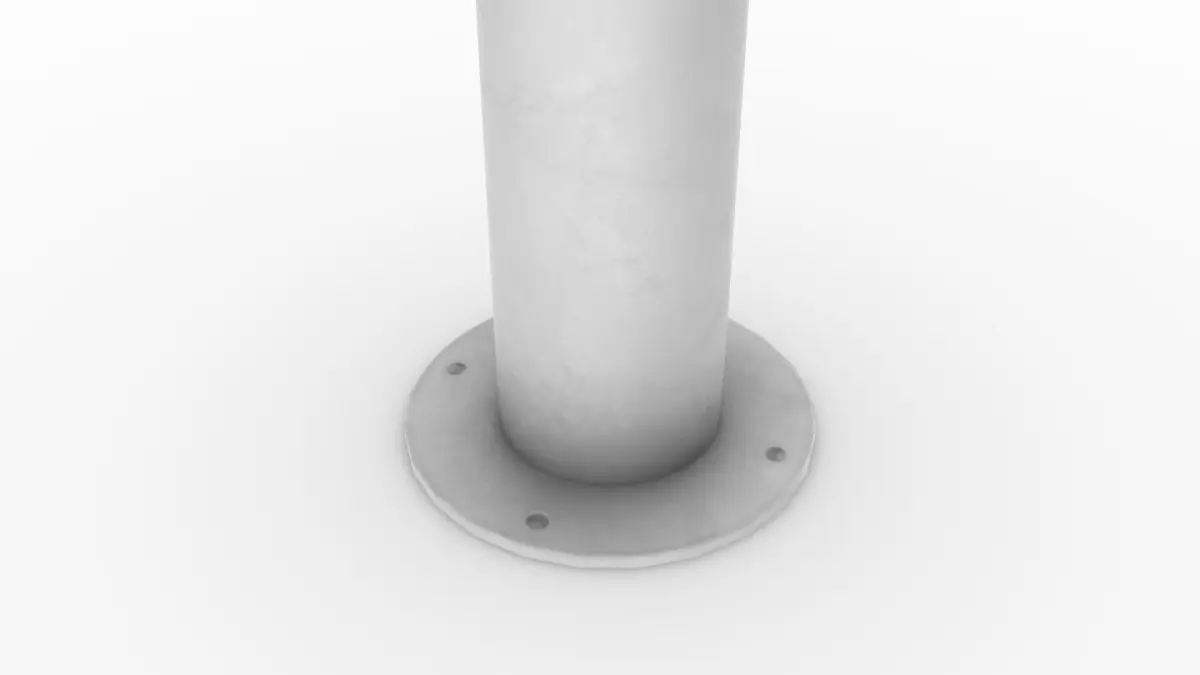 A modern take on a classic cylindrical bollard. This model is stainless steel with a ground mounting plate, perfect for city or urban landscapes.