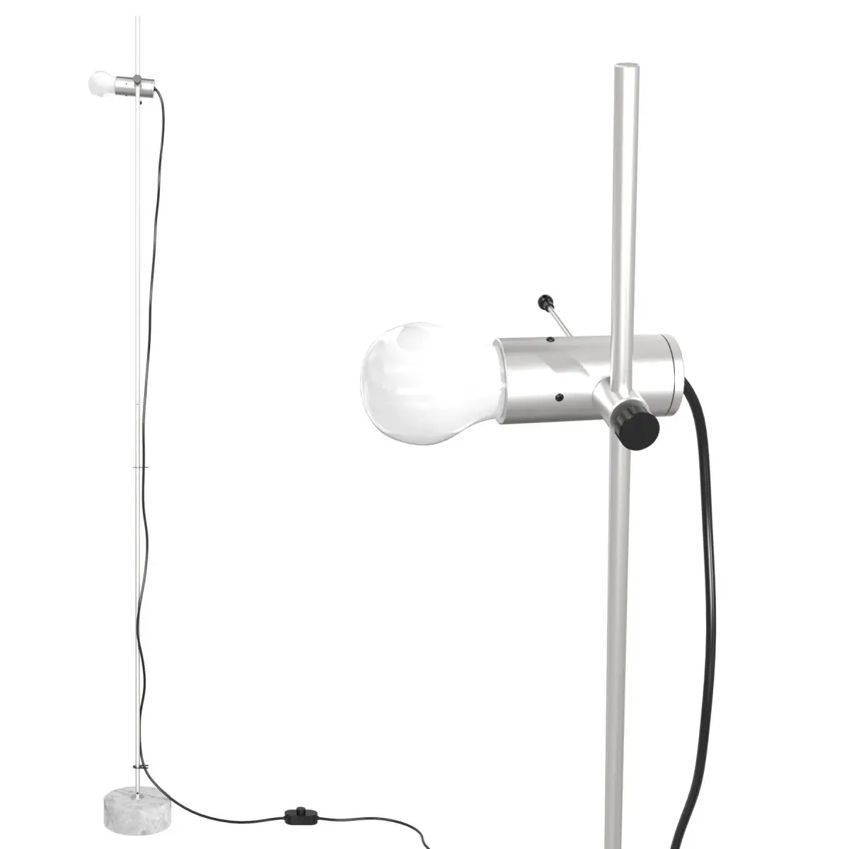 Italian design icon from the 1960s : a minimalist floor lamp by Tito Agnoli for Oluce. It features a concrete base and a stainless steel pole on which the socket can be multi dimensionally adjusted. The socket unit features a stainless steel adjsuting stick which allows to rotate the socket and adjust lighting to the desired position.The lamp has not been rewired and accomodates bulbs originally designed for this lamps. New Re edition bulbs with bayonet feature can easily be sourced online.Creator: Oluce (Maker),Tito Agnoli (Designer)Dimensions: Height: 75.6 in (192 cm)Diameter: 6.7 in (17 cm)