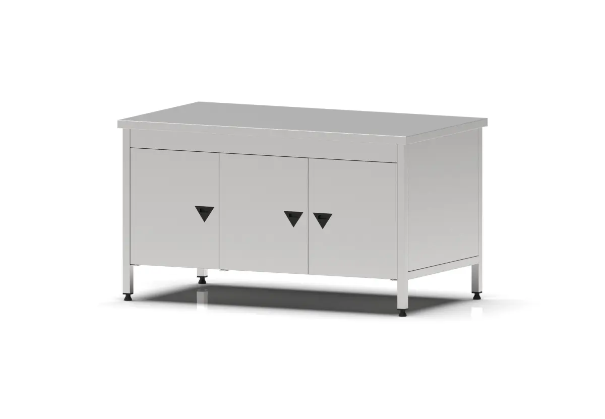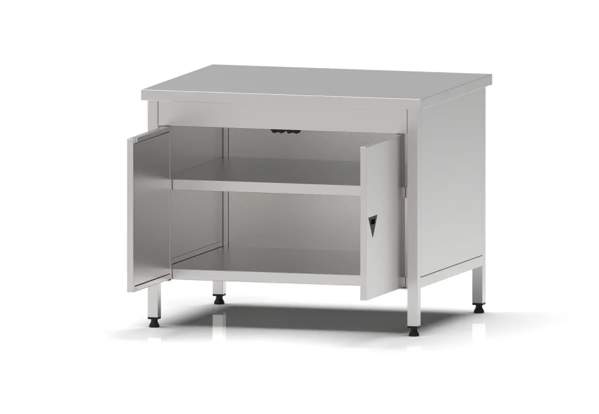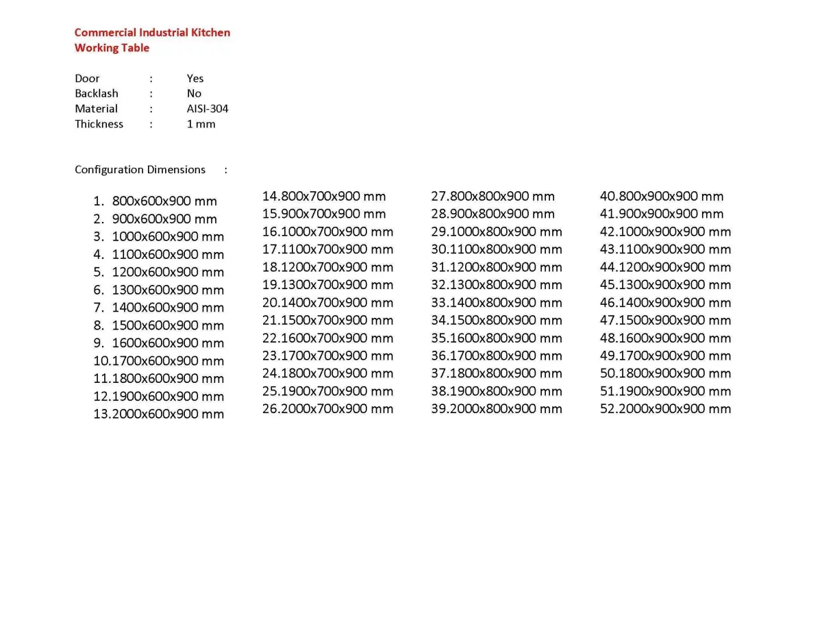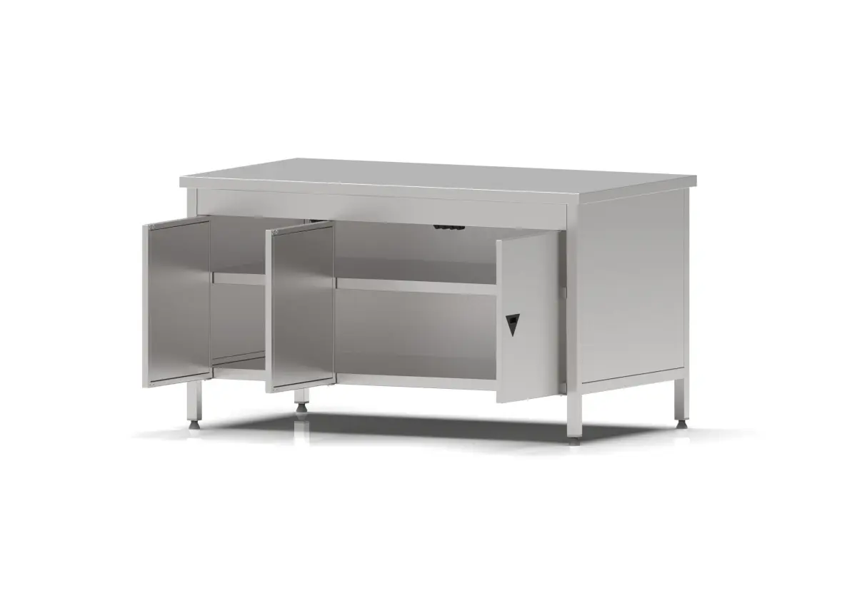 304 Stainless Steel Industrial Kitchen Work Bench with Swing Doors** (included all 60, 70, 80, 90 Series)**Made entirely of AISI 304 quality 18/8 Cr-NI stainless steel sheet and box profile.Top and bottom table, 1.00 mm, drawers 1.00 mm, Doors and covering 1.00 mmReinforced with stainless steel sheet profiles where necessary, depending on the bench length.The legs are made of 40x40x1.0 mm stainless steel stone, closed box profile.The foot ends can be adjusted with plastic ball joints.It can be manufactured in all sizes suitable for need.