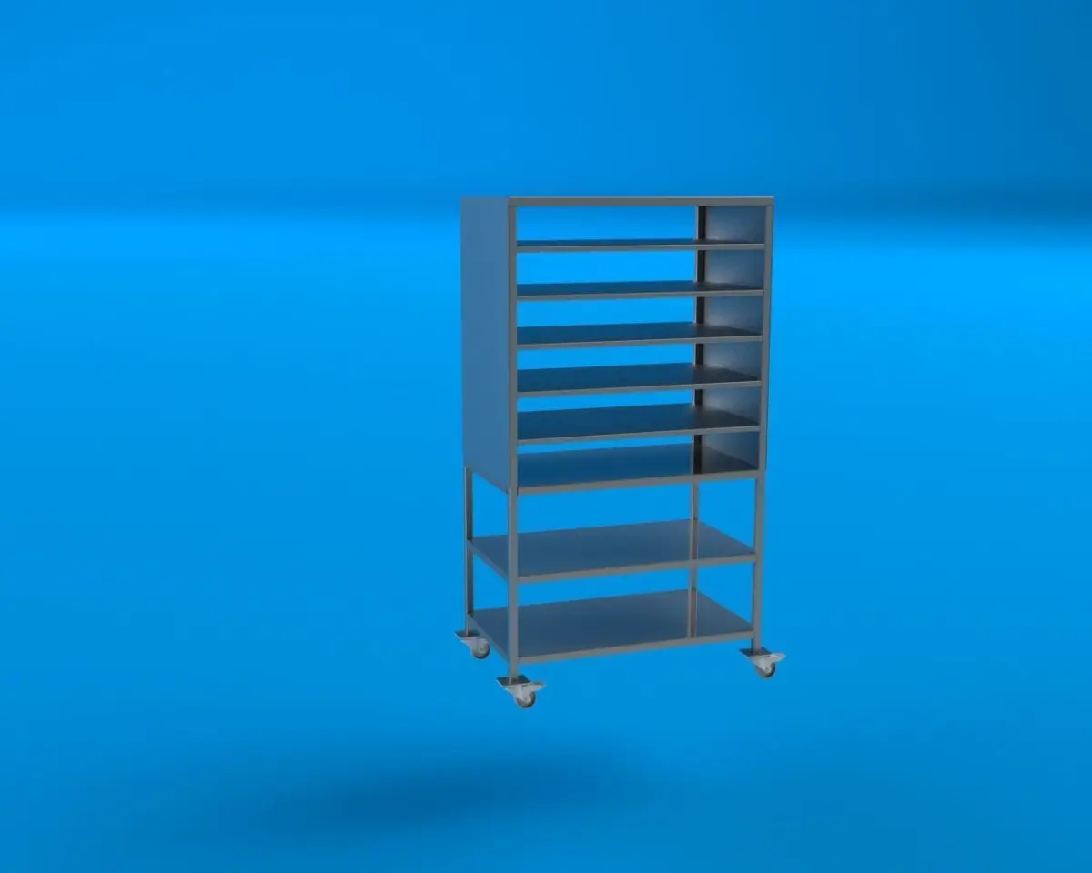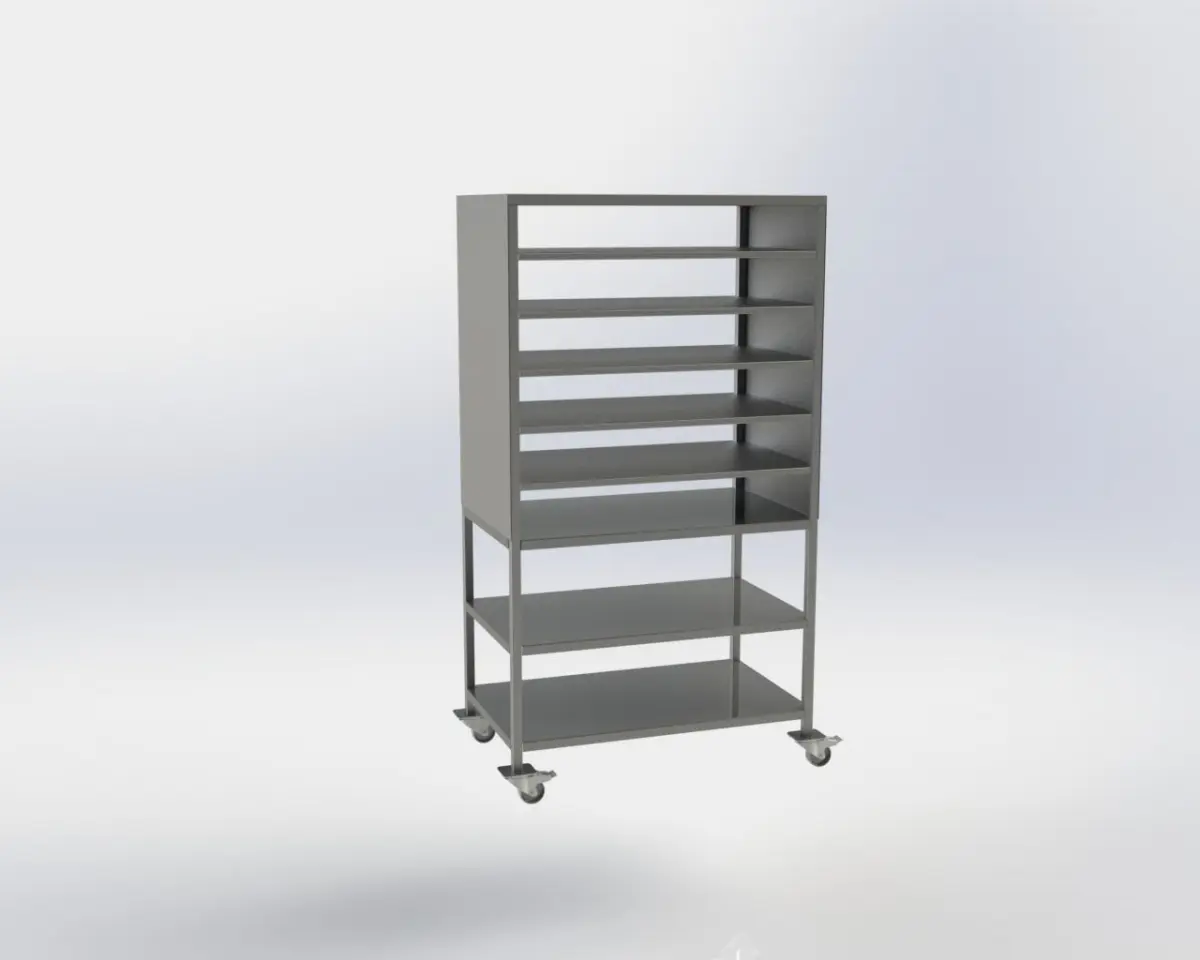 This assembly was made in Solidworks 2021 version. It represents a stailess steel welded rack, used in the food or pharmaceutical industry, to store food or medicines. I have uploaded the dimensioned assembly drawing, step, obj and other files. The stainless steel rack is made of square pipe 30x30x1.5 AISI 304 and bent stainless steel sheet AISI 304. The wheels used are also made of stainless steel and have a diameter of 80 mm. This model was physically created and tested.