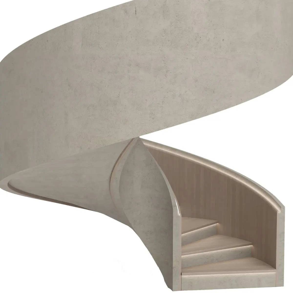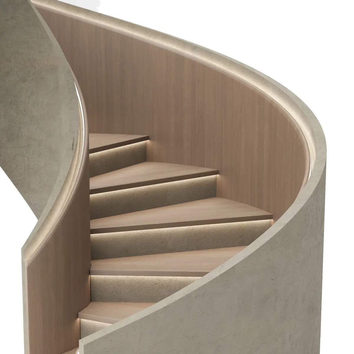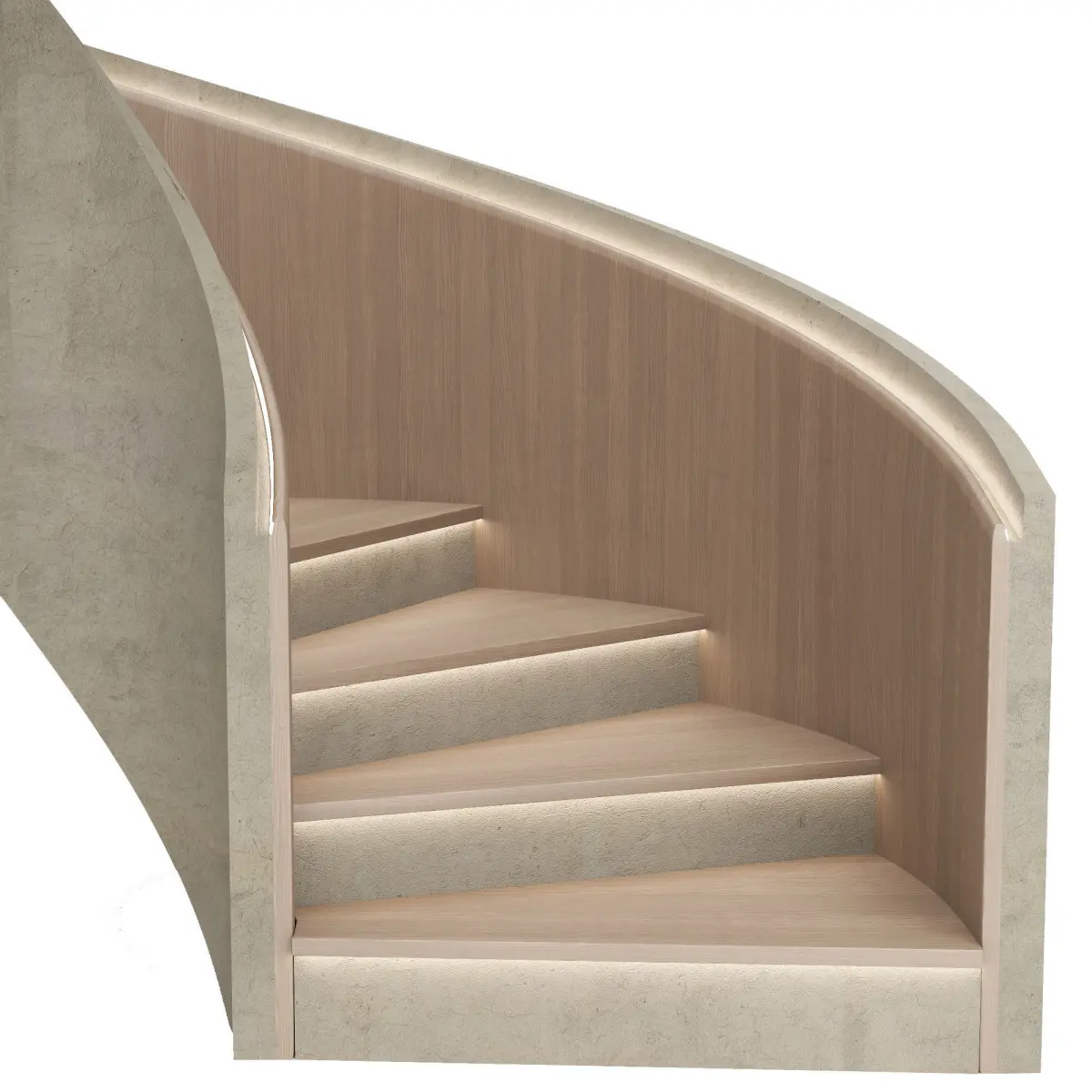 The original staircase in a modern style with decorative wood panels and lighting. Perfectly fit into many interiors.Good renders!