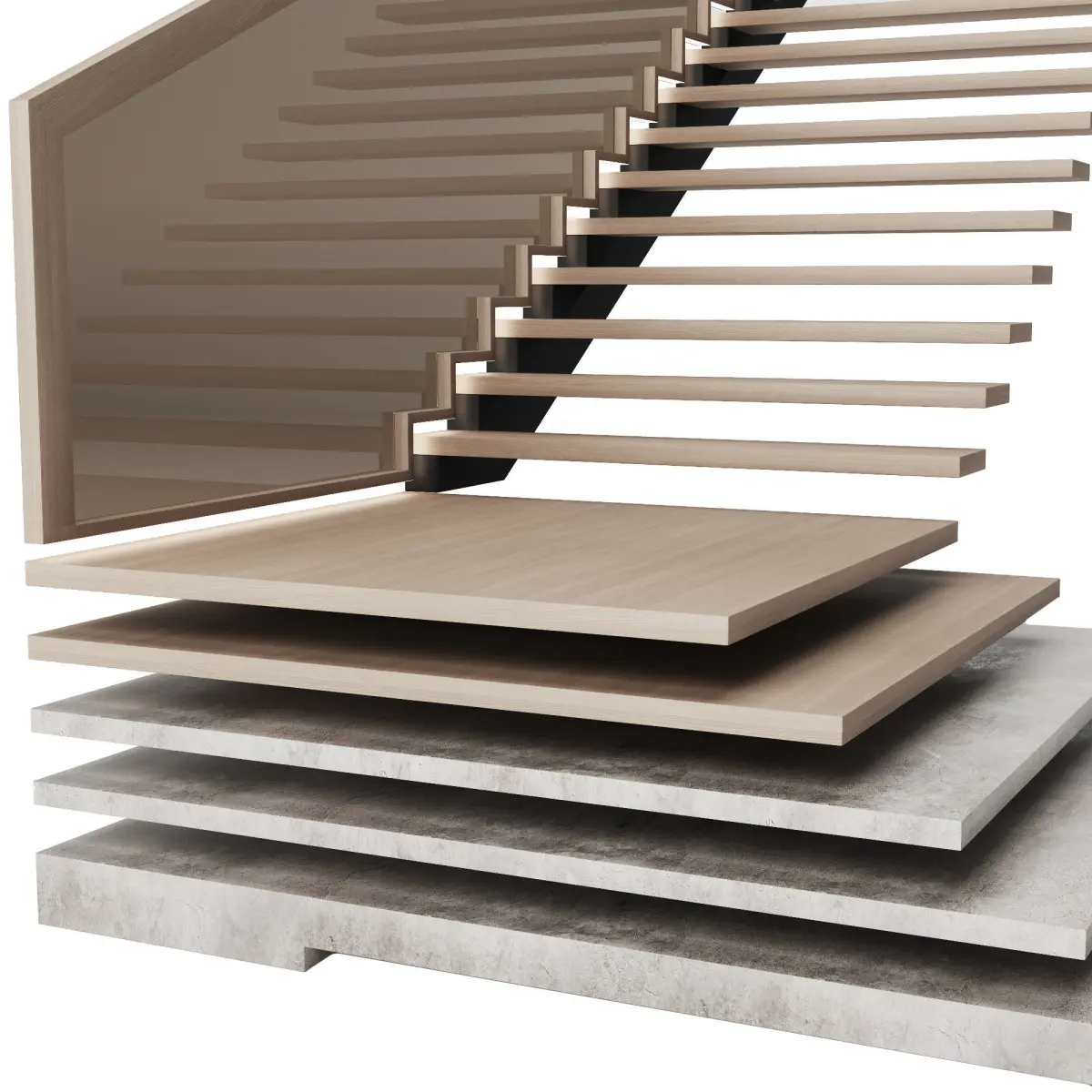 The original staircase in a modern style. Perfectly fit into many interiors. The staircase is made of wood and stone, the railings are made of wood and glass. The railings are also illuminated.Good renders!