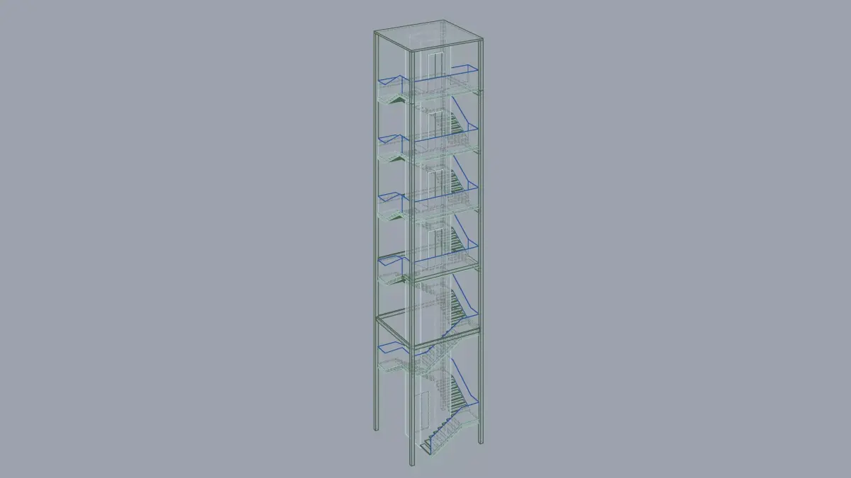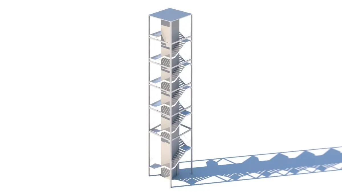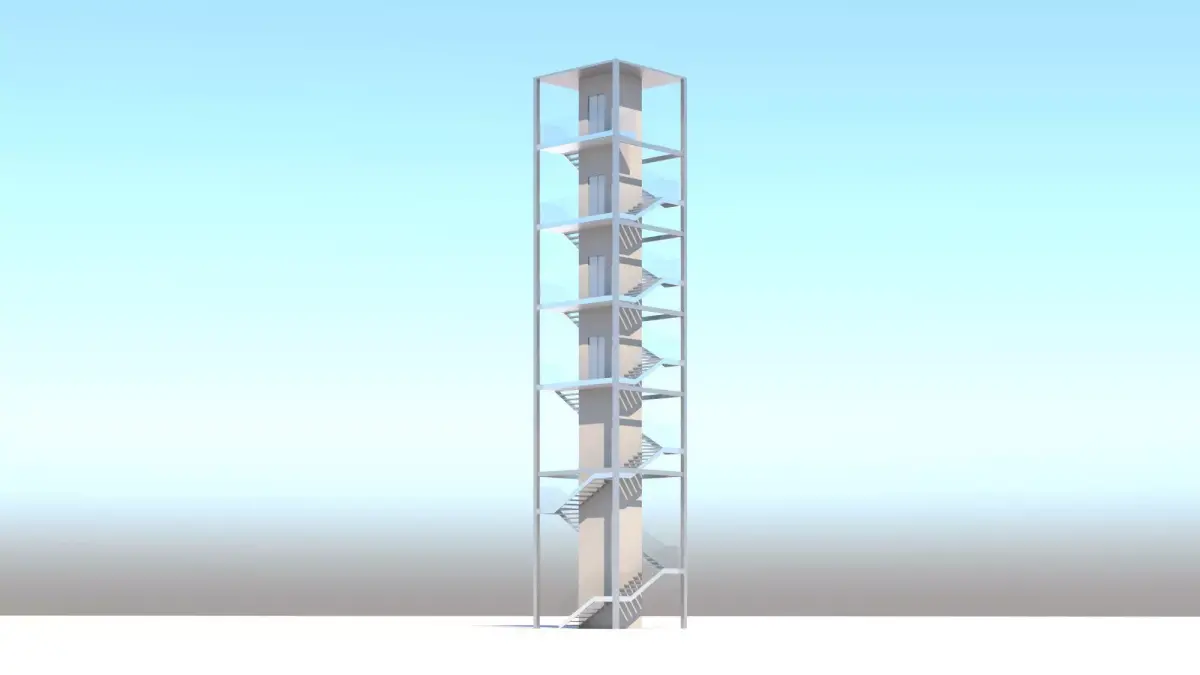 Staircase along with a central elevator for large buildings. This particular model was created for a big residential building. Metal, concrete and glass structure perfect for contemporary designs and minimal approaches. Vertical circulation is made possible in a compact way.