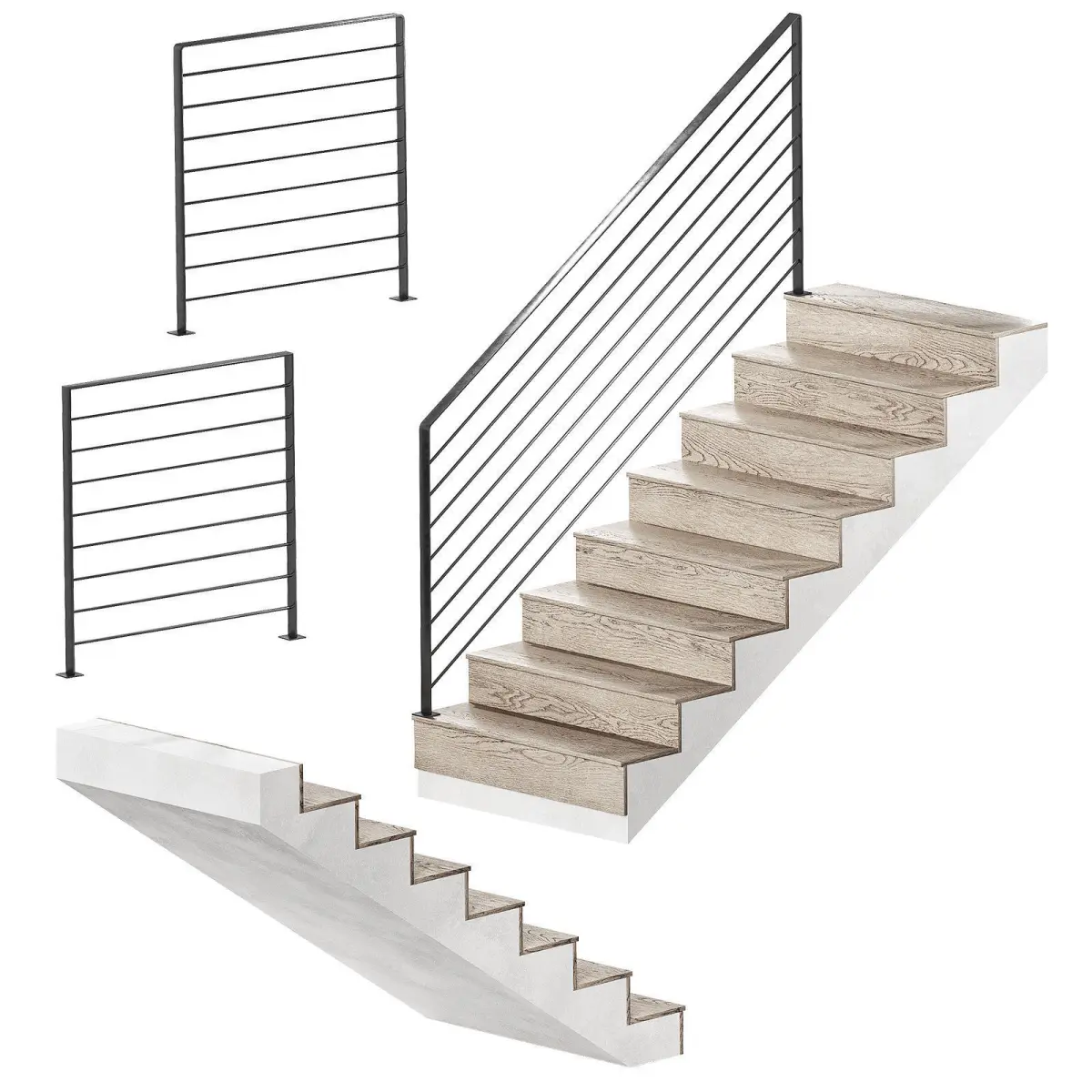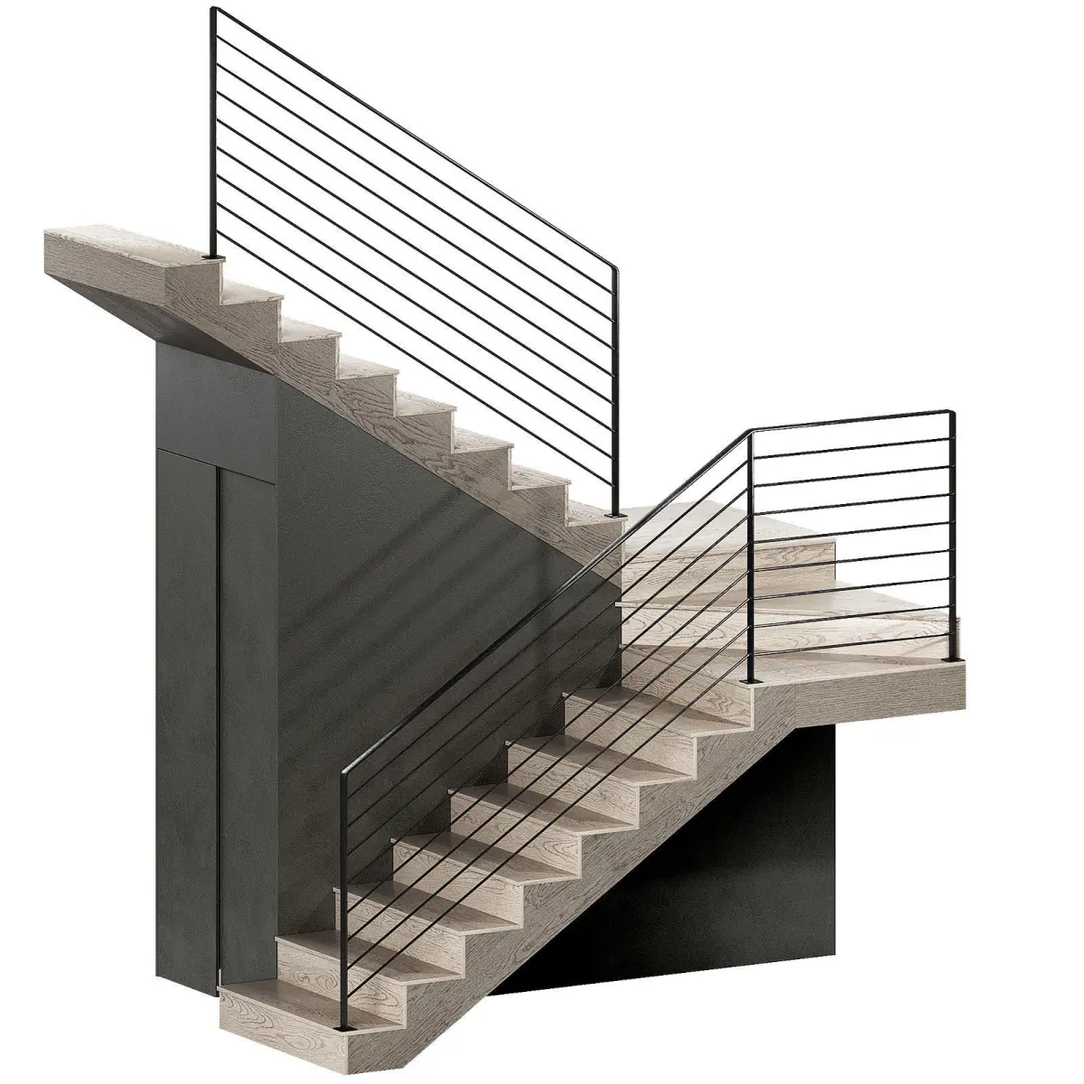 The 3D model contains a staircase with wooden steps and metal railings.The top step of the stairs is at 3 meters.The width of the flight of stairs is 1 m.The design is modular - easy to edit to your own size and configuration.There are winder steps.Can be used without the bottom panels of the stairs.Metal fencing in the loft style can be used separately - the model straight modules.It's easy to change the color of the plaster using corona color / vray color.