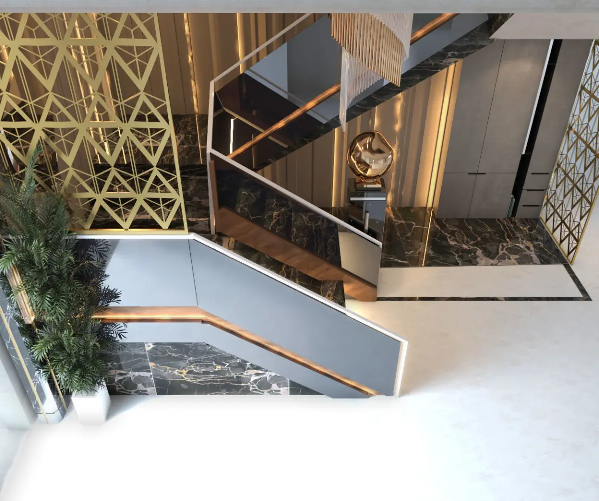 Luxury Design for U shape stairs with gold, wood and marble material with indirect light ( 3DSMAX 2019 modeling and V-RAY 5) , all the material and texture and light setting in zip. file ,