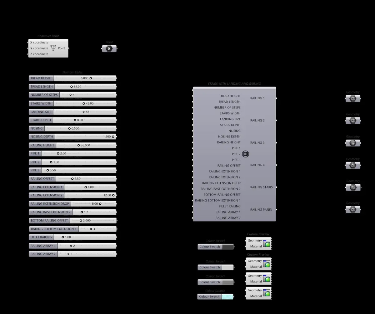 This is a Grasshopper cluster that creates a set of Parametric Stairs with Landing and Railings.You can make unlimited variations of this model by changing the sliders.