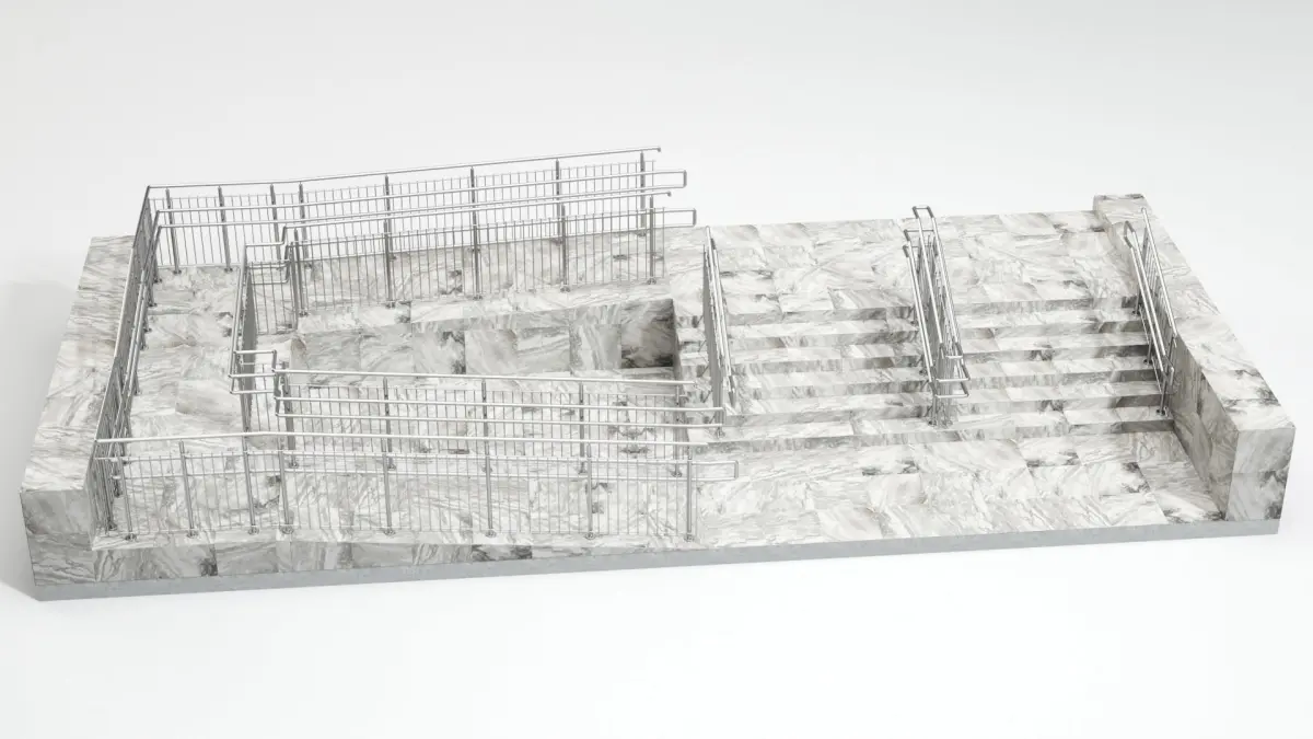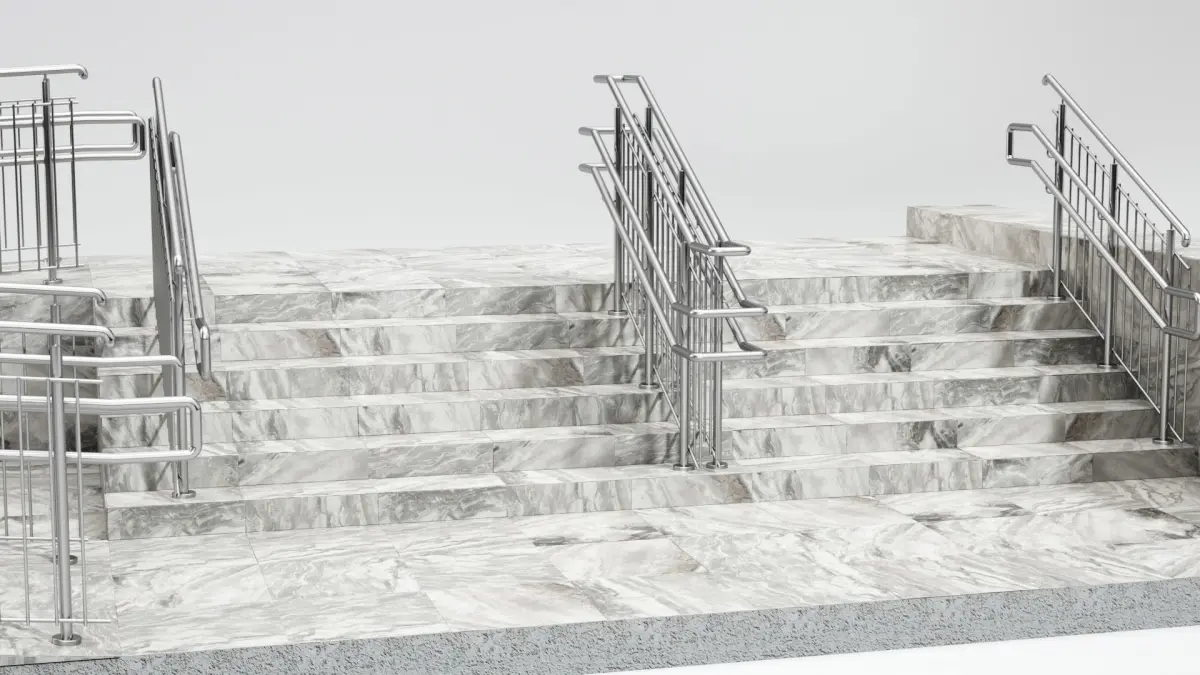 Stairs with vertical railing and ramp.