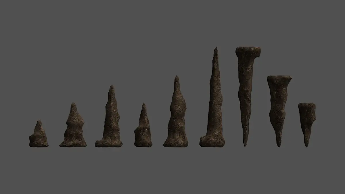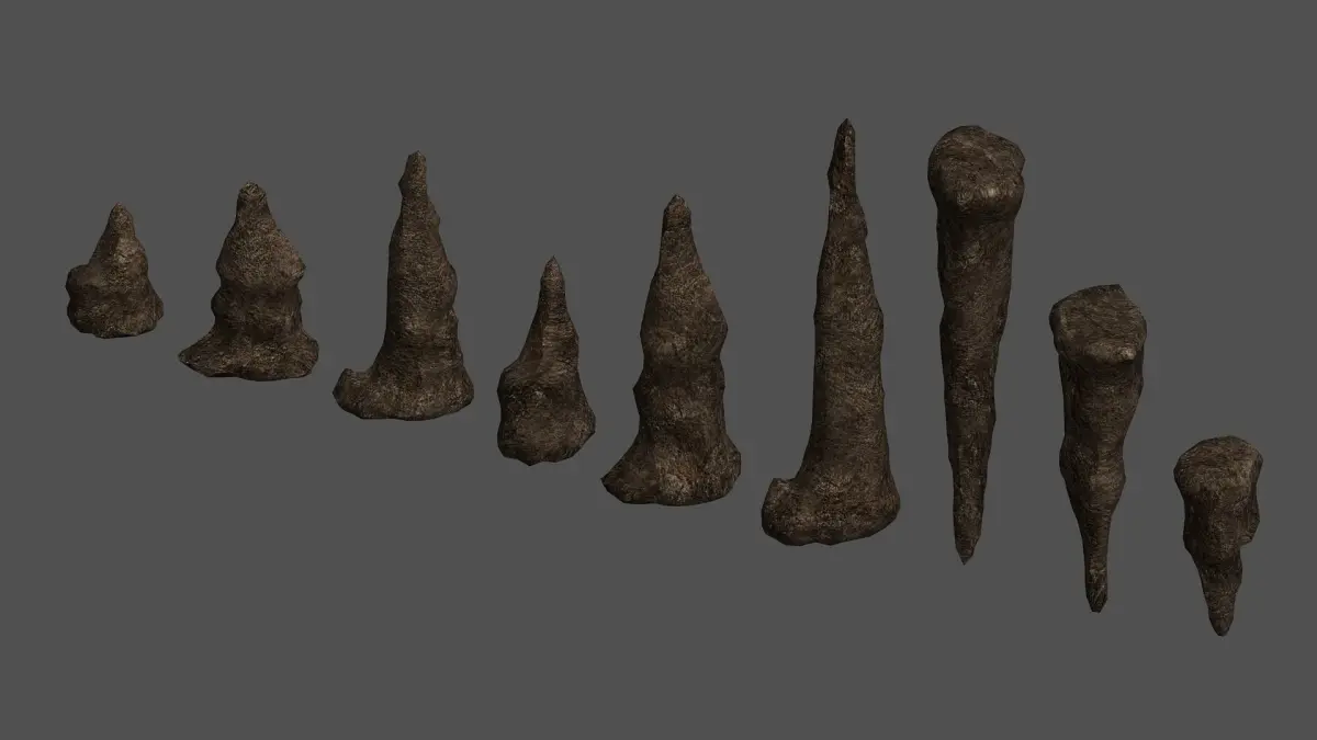 A collection of nine stalagmites I made in Sculptris. All nine rocks share the same 2K texture. The set includes a tileable wall/floor texture, in 1K. All textures are in .png format and include Diffuse, Specular, Height, and Normal maps.