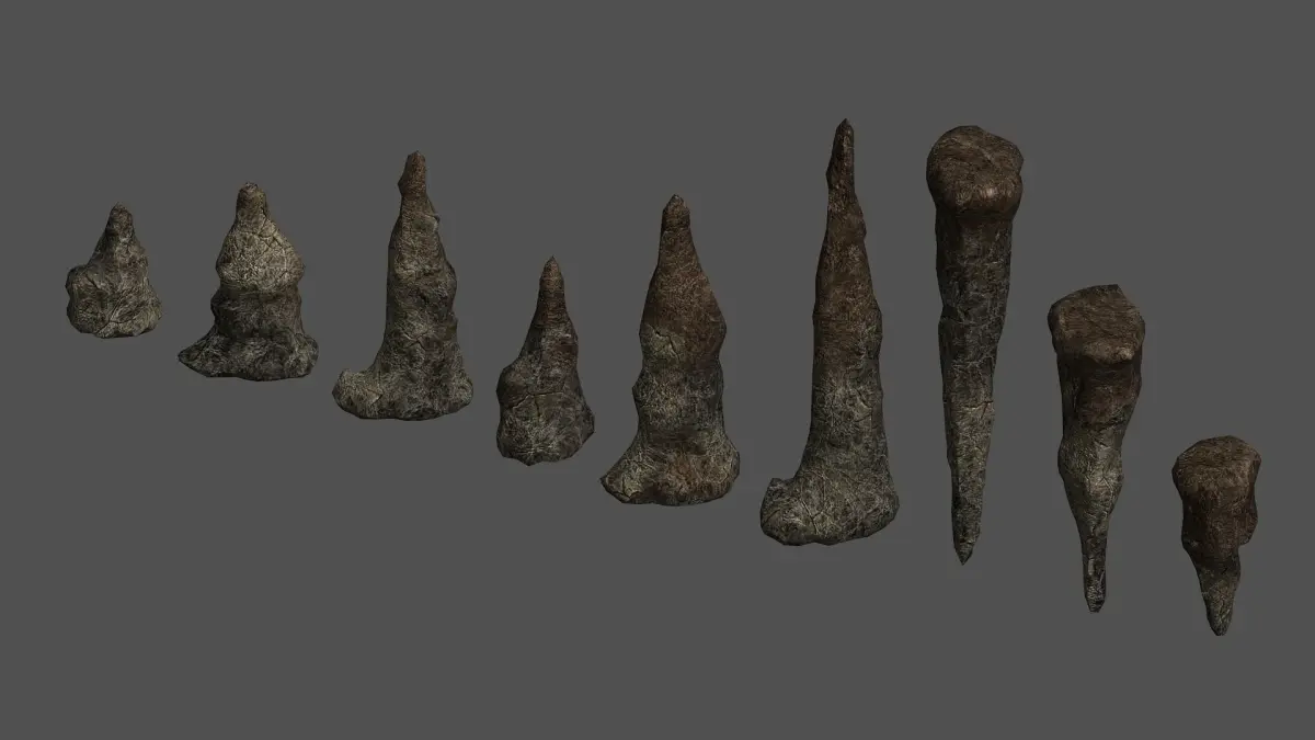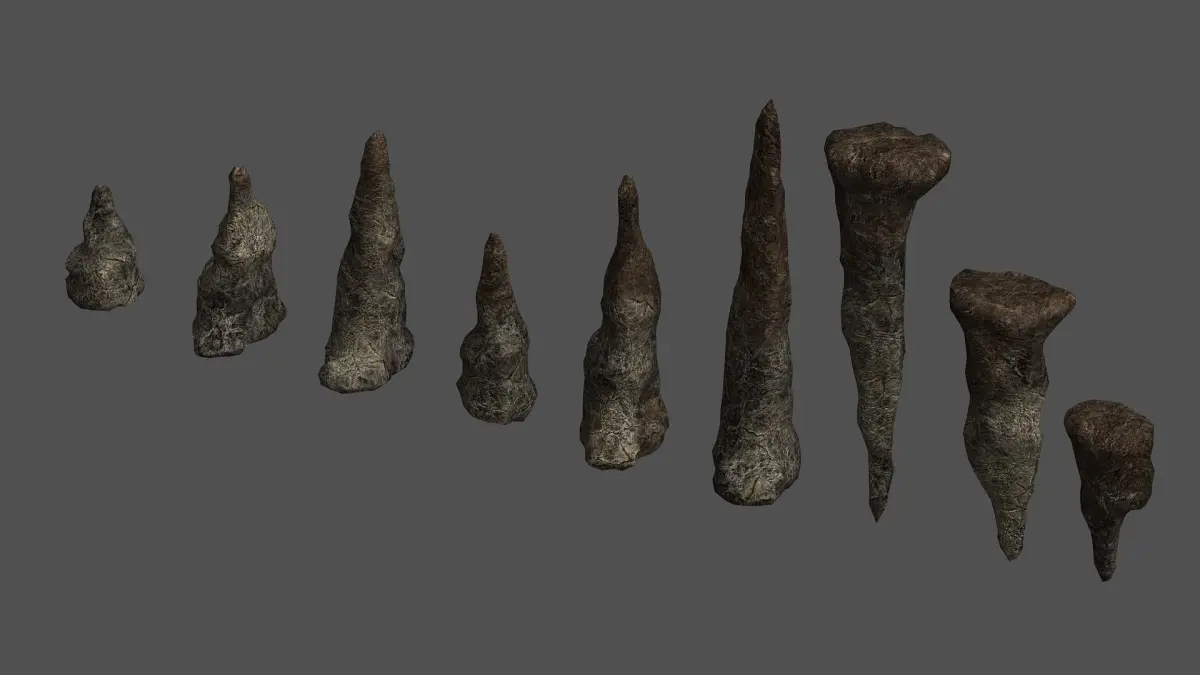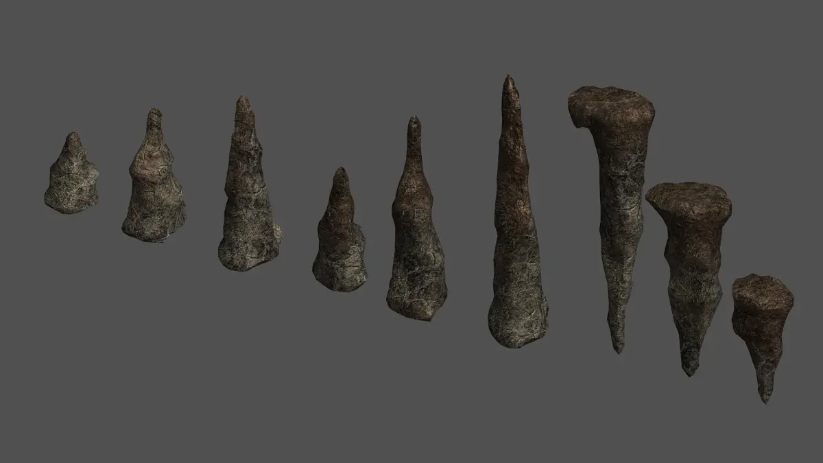 A set of stalagmites I made with Sculptris. The models and base textures for this set are free - have a look at the rest of my models to find them or search for Stalagmite Set.