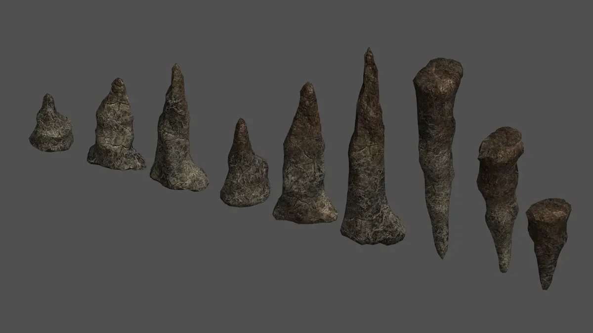All 9 stalagmites share the same 2K texture. In addition, there are 4 tileable 1K floor/wall textures. All textures are in .png format and have Diffuse, Specular, Height, and Normal maps.