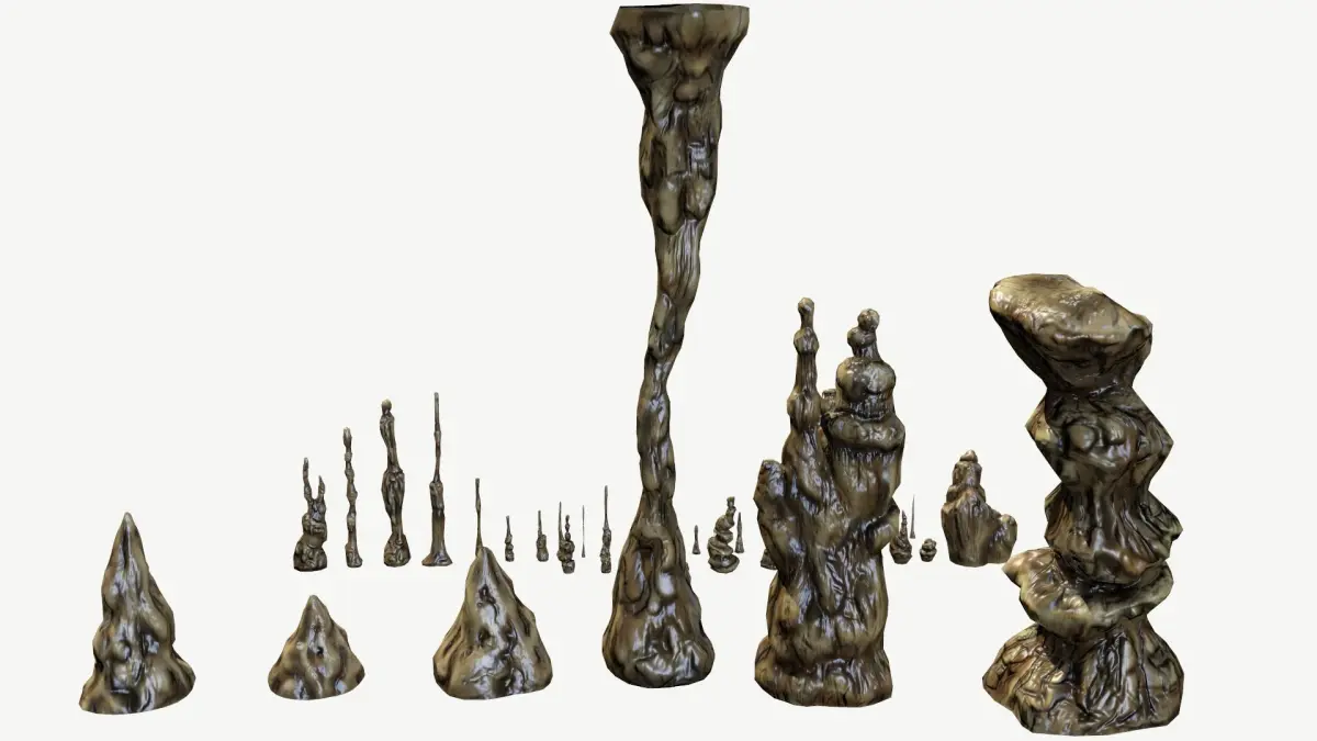Unique-looking stalagmites are individually textured and the smaller generic ones are grouped into an atlas.