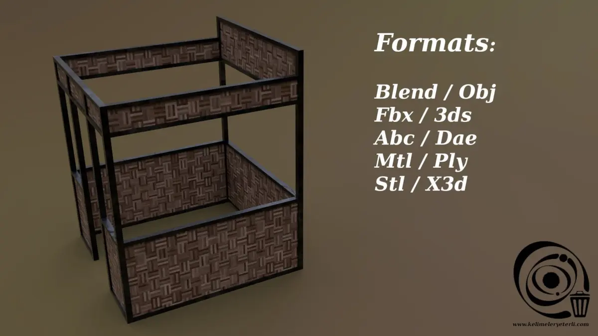 File formats: Blend / Obj / Fbx / 3ds / Abc / Dae / Mtl / Ply / Stl / X3d
