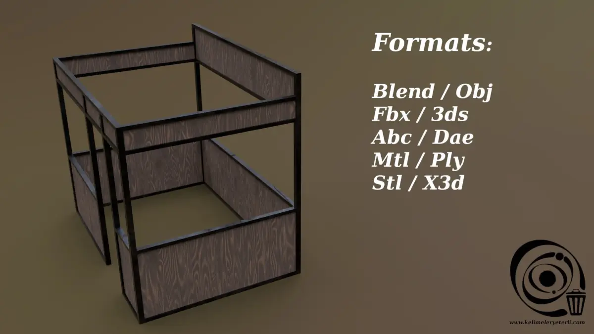 File formats: Blend / Obj / Fbx / 3ds / Abc / Dae / Mtl / Ply / Stl / X3d