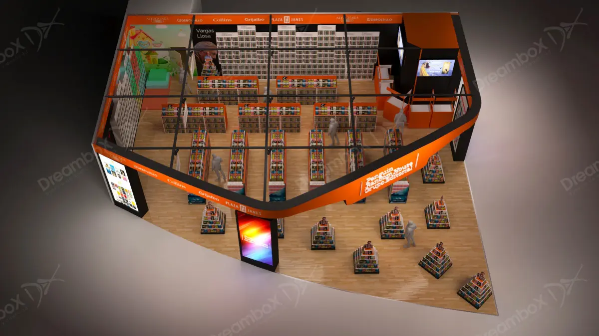 Stand for editorial of books, in international fair, with modules for books, shelves, showcases, columns for led screens, lighting, cash registers, modules for 700 books, light boxes capacity for 100 people