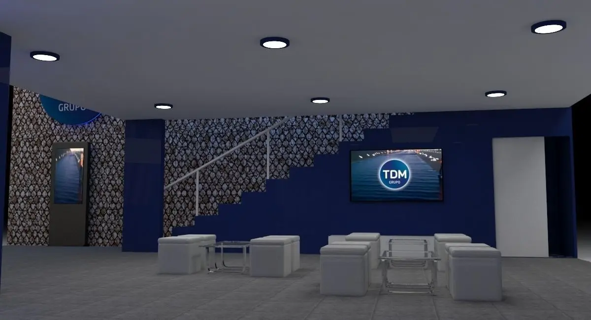 Stand for mining company, with two floors for its customers with led screens, led lights on roof with displays for prodcuts