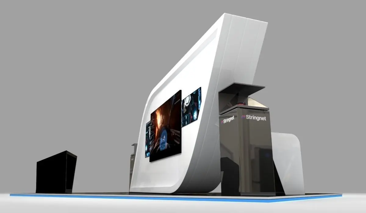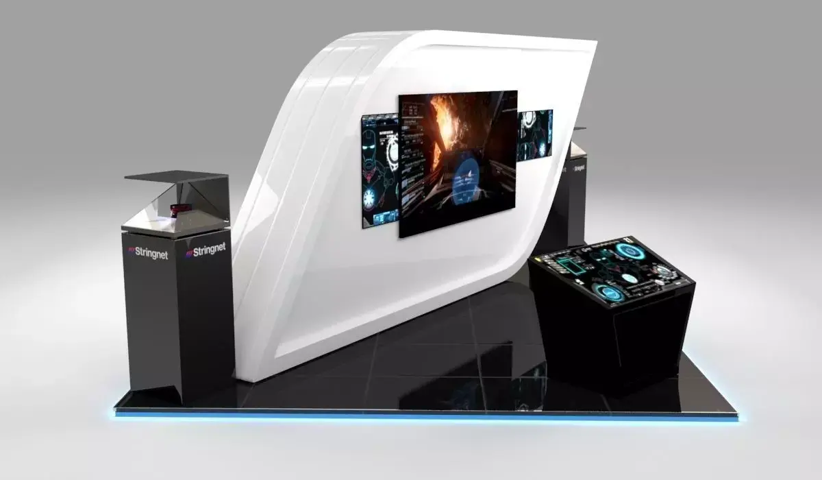 Stand for technology company in events, with an avant-garde structure with screens and holograms