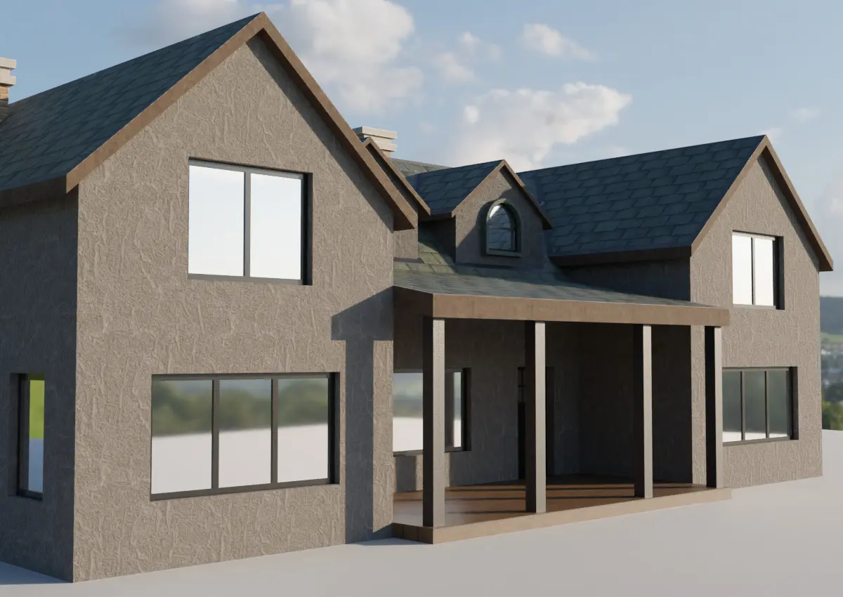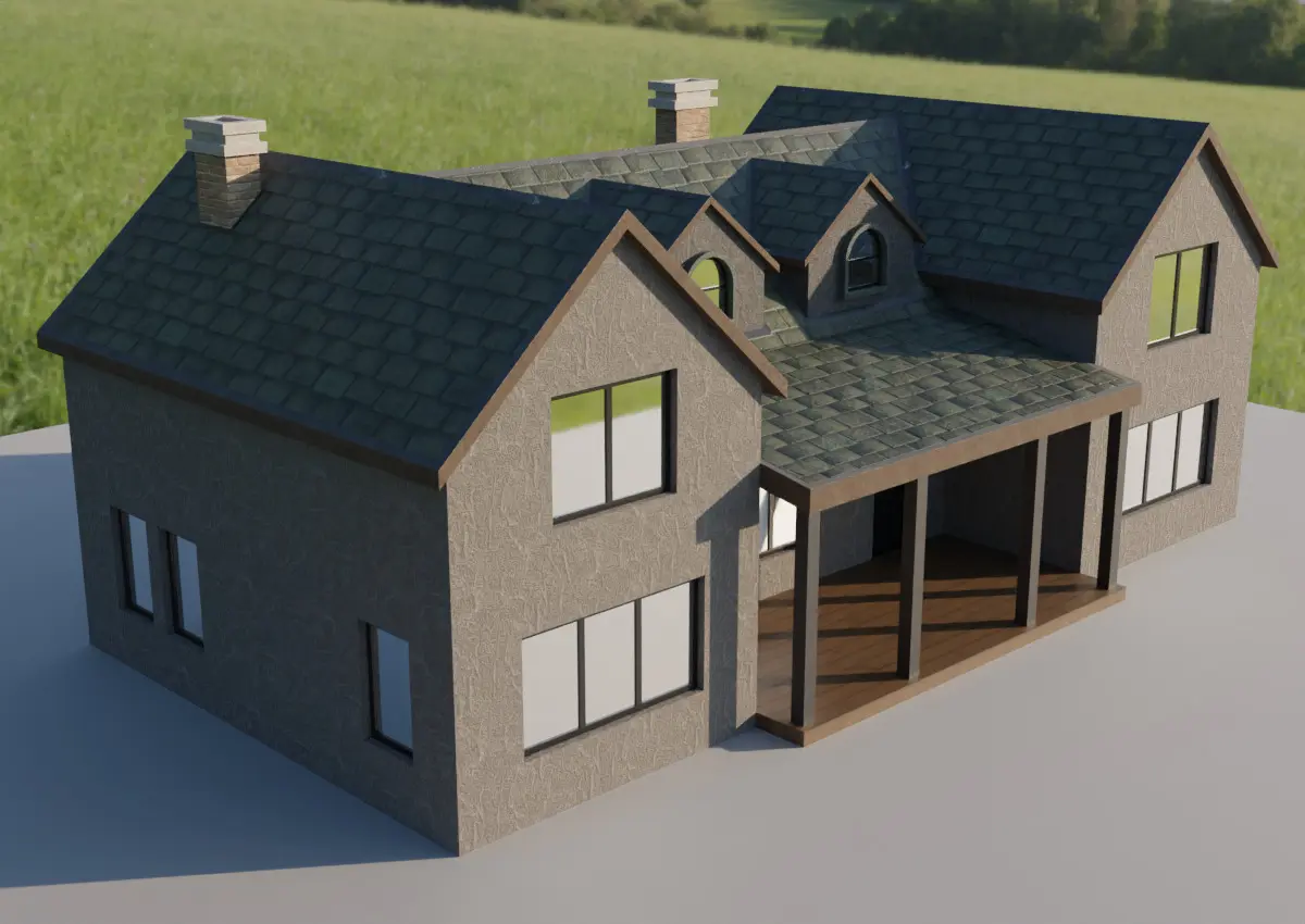 This is outside view of the house (no interior). So windows' glass is not real (transparent) Glass Shader. It's textured as mirror (color white, metallic 1, roughness 0.04).