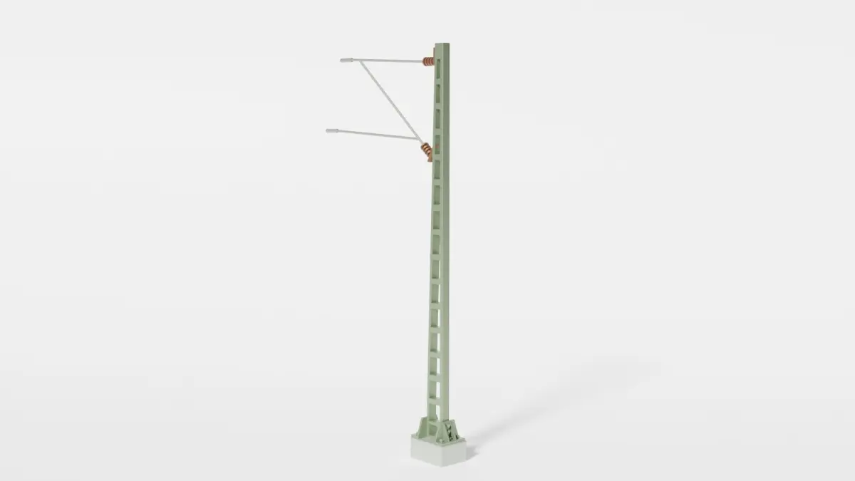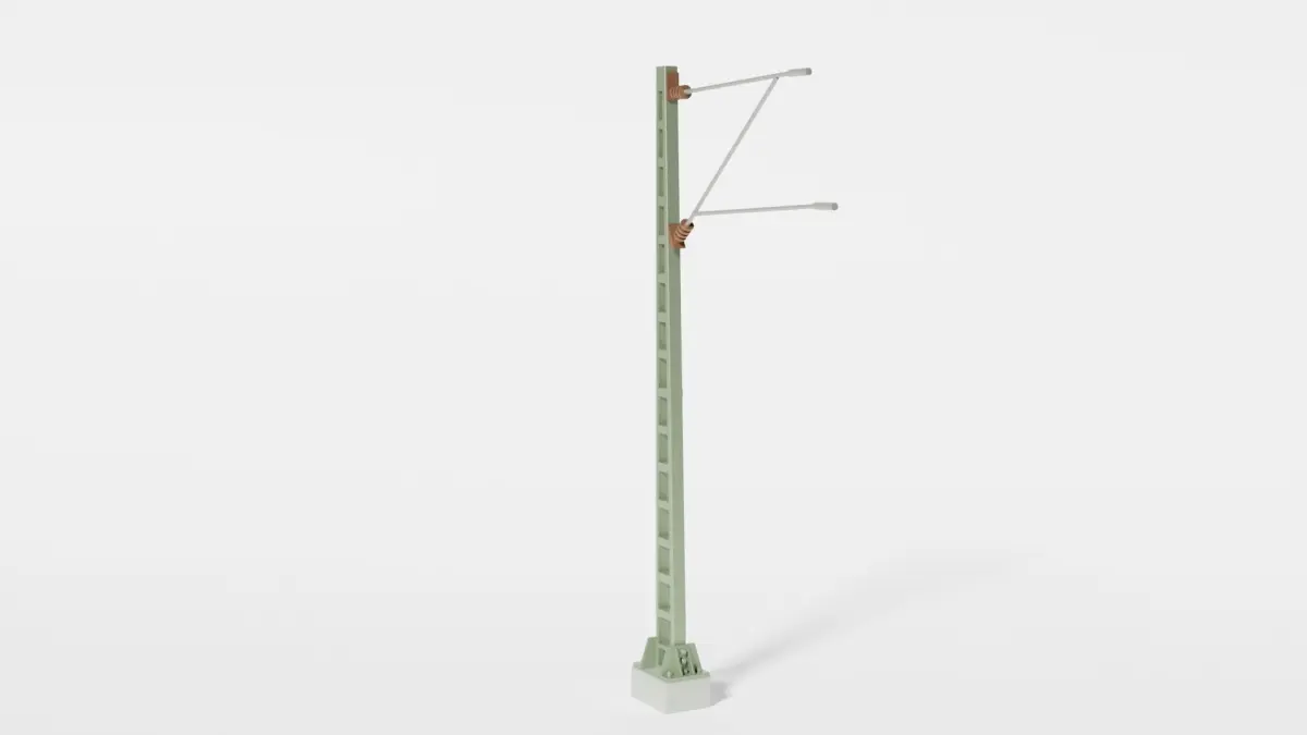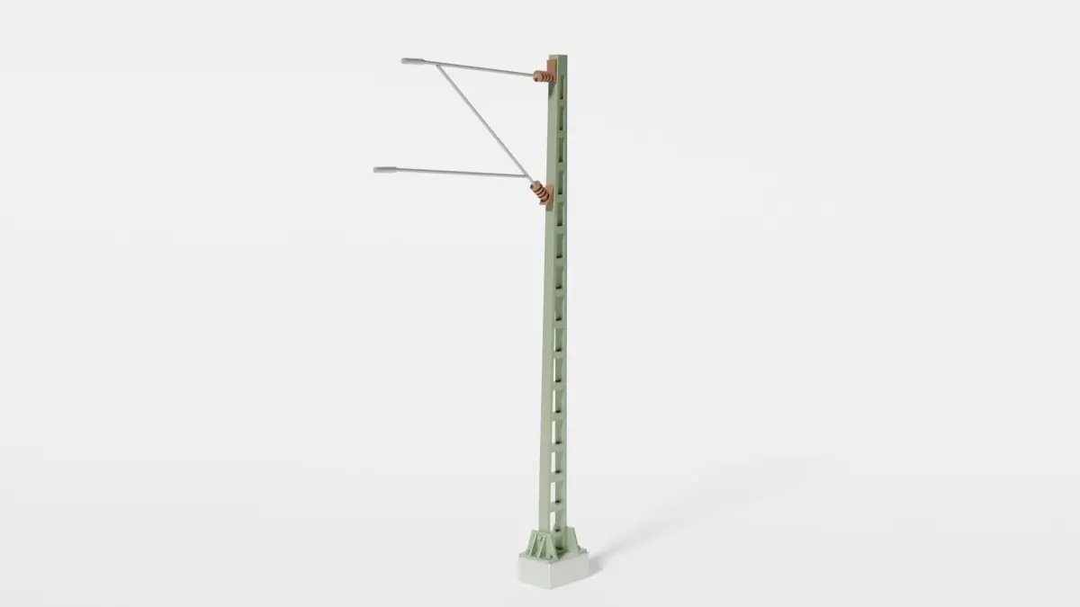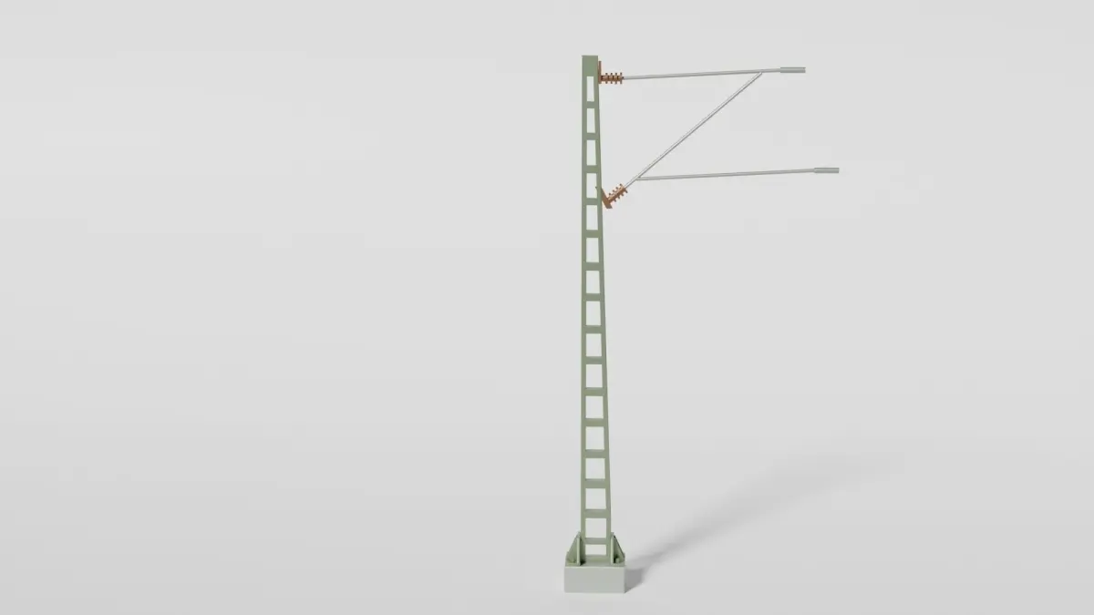 Model of typical standard overhead line mast / catenary wire mast for railway track applications. Textures and material are included. Other file formats x3d. The texture map is a bmp file.
