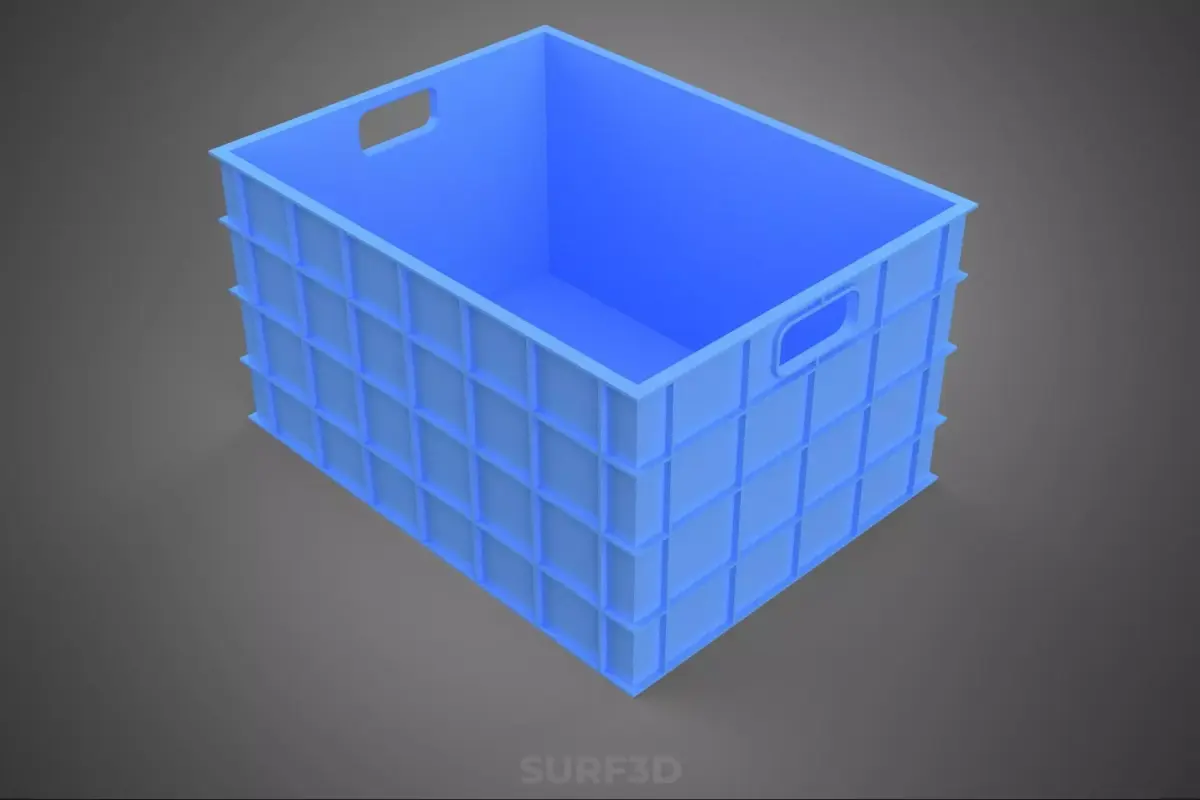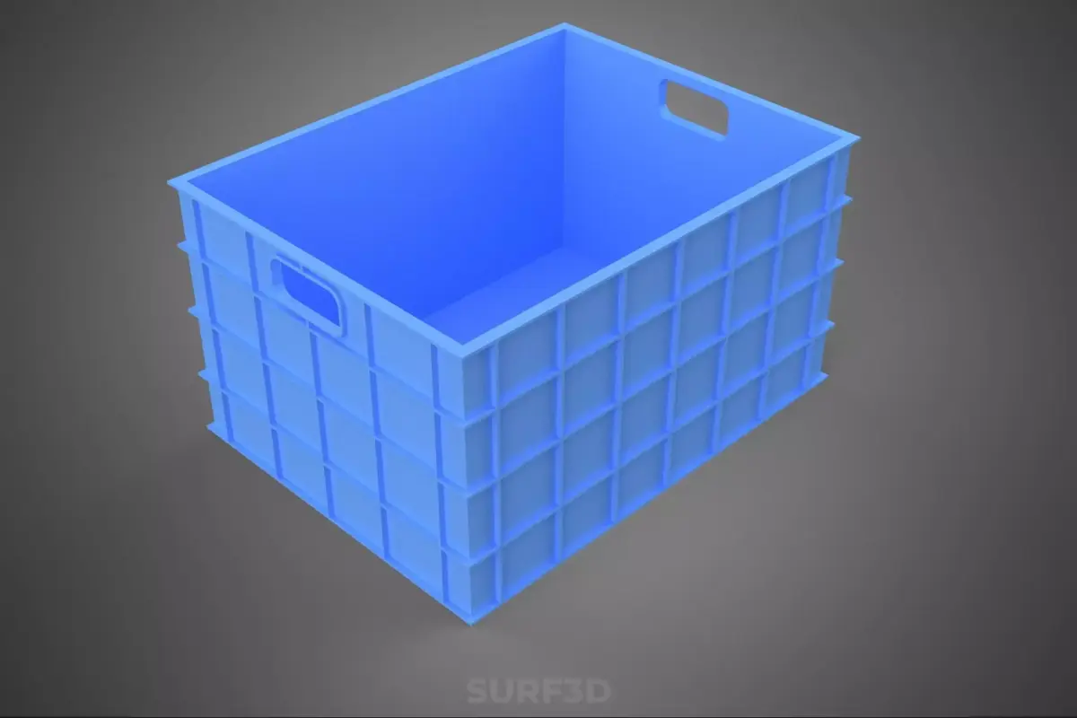 The containers are produced almost universally via injection molding, a process ensuring structural integrity, dimensional precision, and uniformity across batches. Typical construction features include reinforced ribbing along the edges and corners to enhance rigidity and dynamic load-bearing capacity. Many iterations include perforated or lattice-structured sidewalls and bases (often referred to as 'ventilated crates') to facilitate airflow, cooling, and drainage, essential for the transport of perishable goods such as fresh produce or chilled products. Containers intended for liquid or small-component containment feature solid, non-perforated walls.