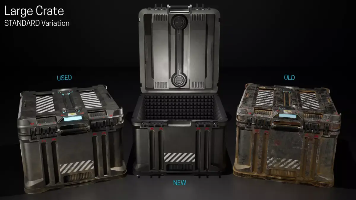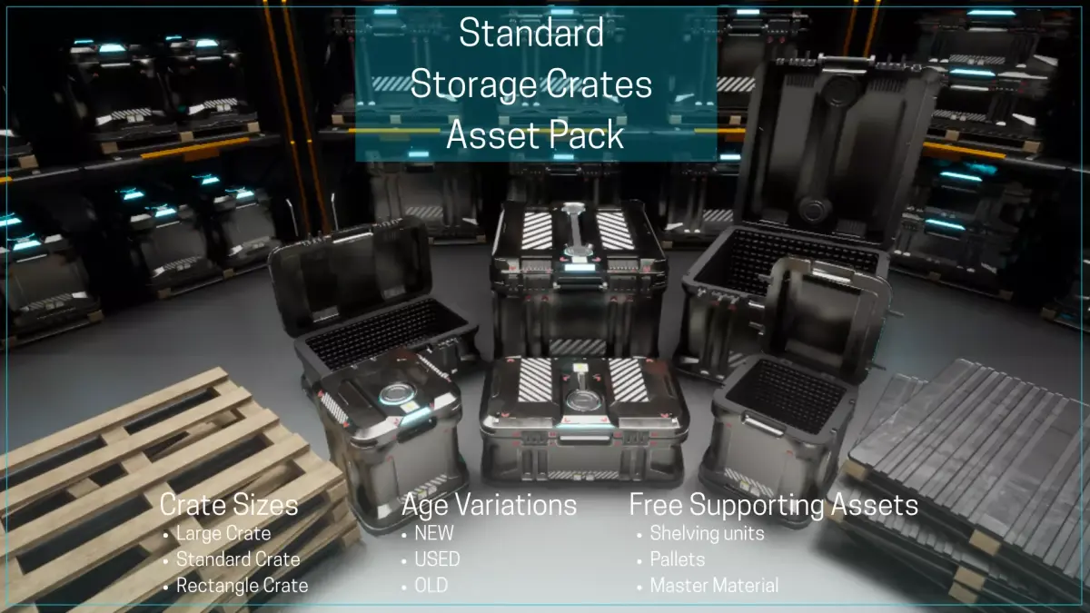 What’s Included3 high-quality crate models: Large Crate, Standard Crate, Rectangular Crate3 age states: New, Used, Old9 unique crate variations in totalAdvanced Master MaterialOne powerful master material with controls for:Base colorDirt levelsMetallic propertiesSurface imperfections…and more for easy customizationFree Supporting Assets2 pallets for storage and transportShelving unit with:Gate variation for secure storageNo-gate variation for open accessPre-Built Blueprints & MaterialsExample map showcasing pre-made set dressing blueprints for each age variation, combined with supporting assetsMaterial instances ready for quick adjustmentsAlternate crate models with multiple material IDs for flexible use of material instances