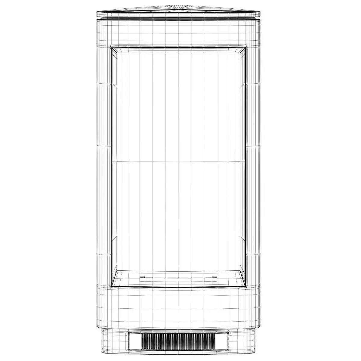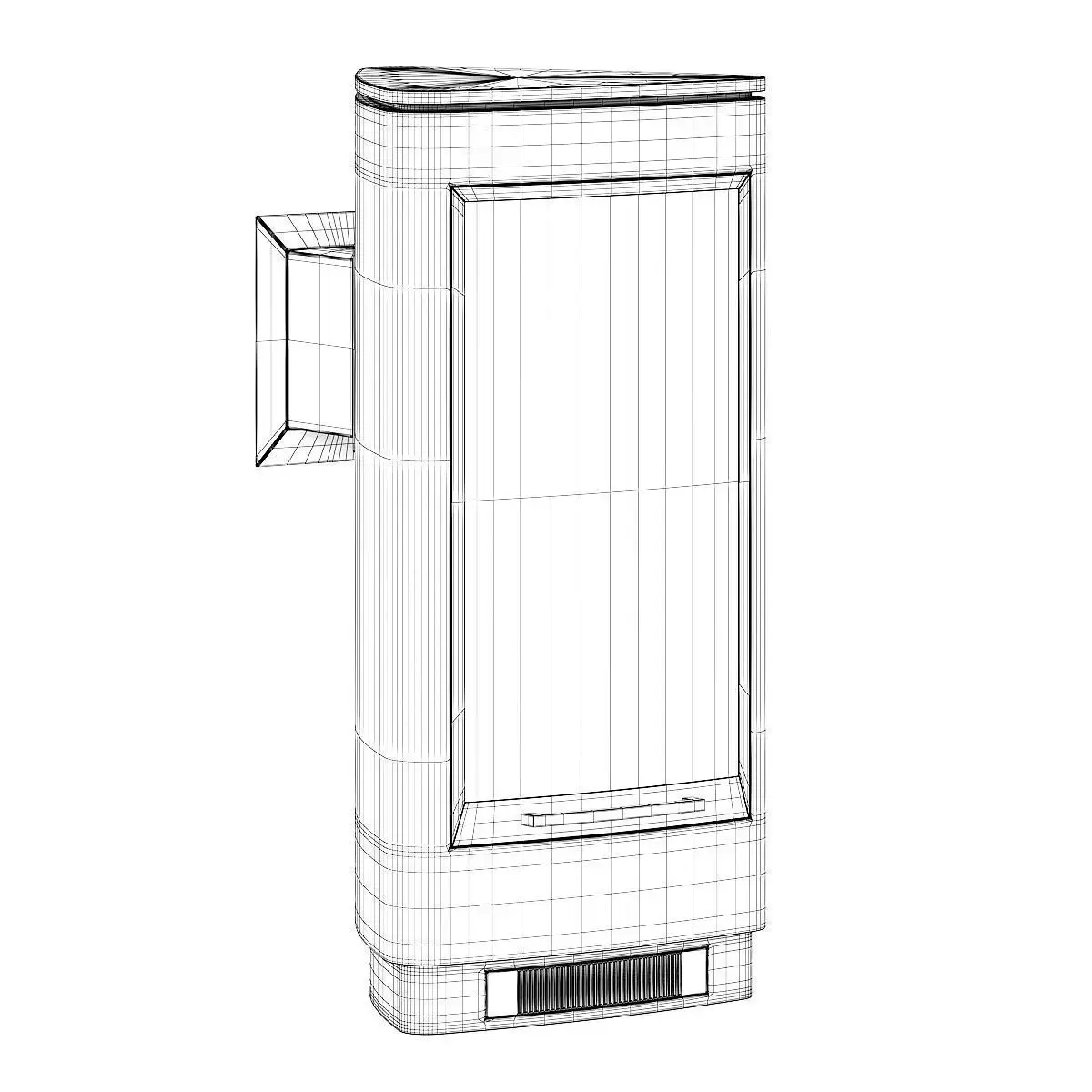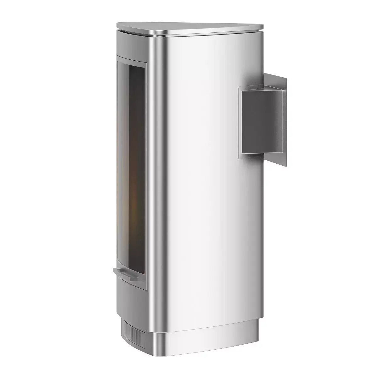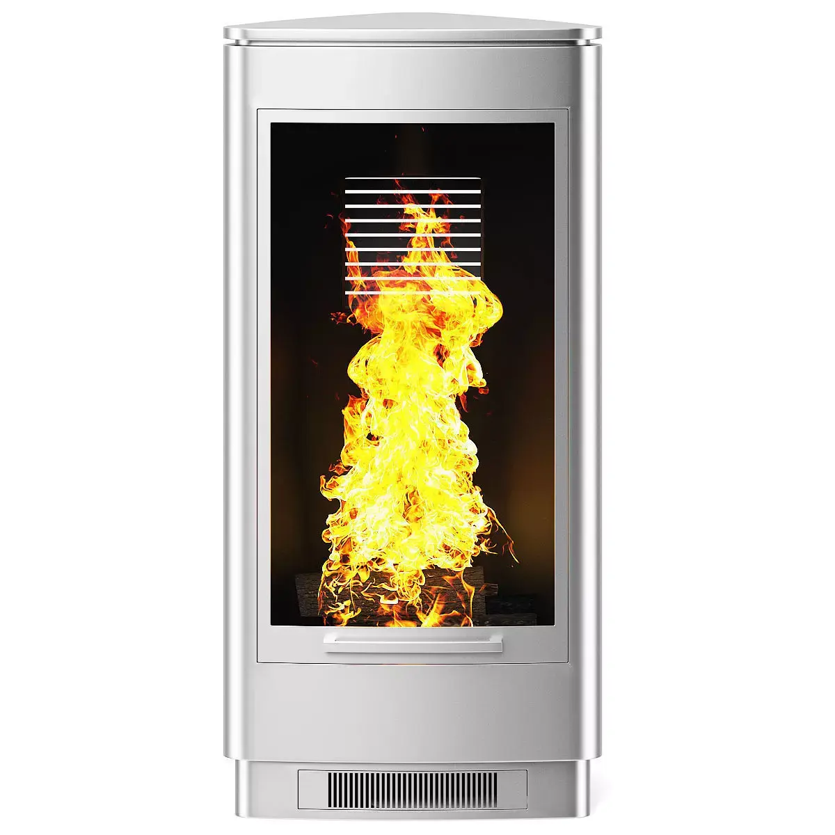 Modern looking metal fireplace with glass door and brushed chrome material. This 3D model contains also illuminative fire material.