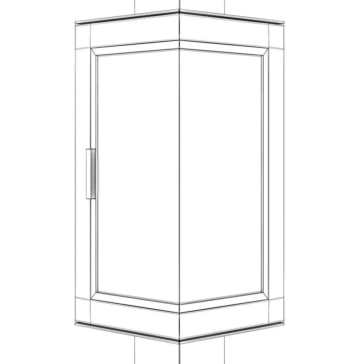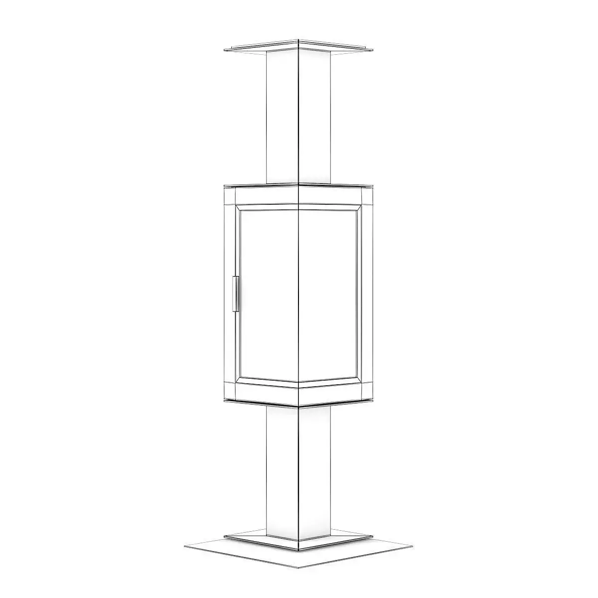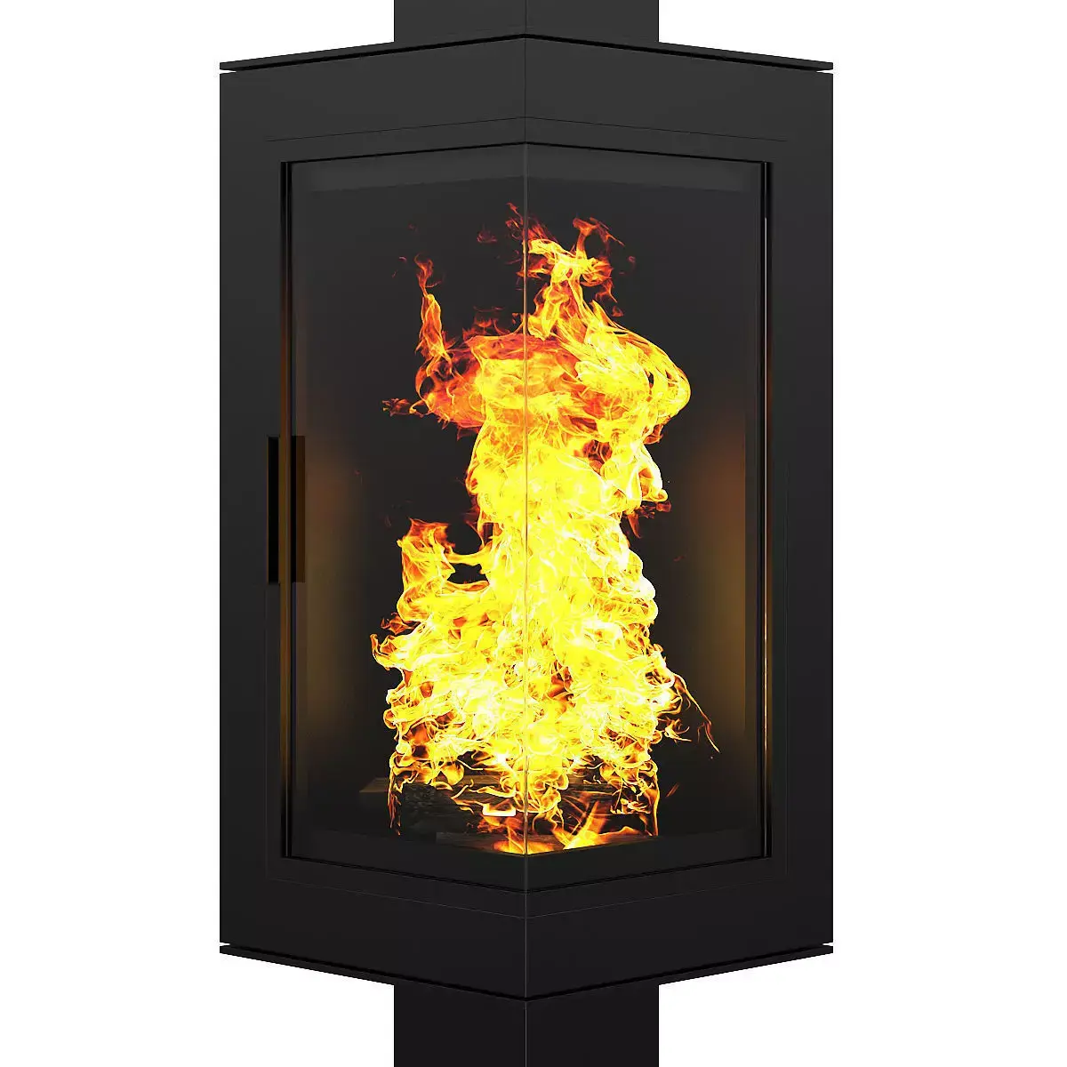 Rectangular standing fireplace made of black metal with glass corner door. This 3D model contains illuminative fire material.