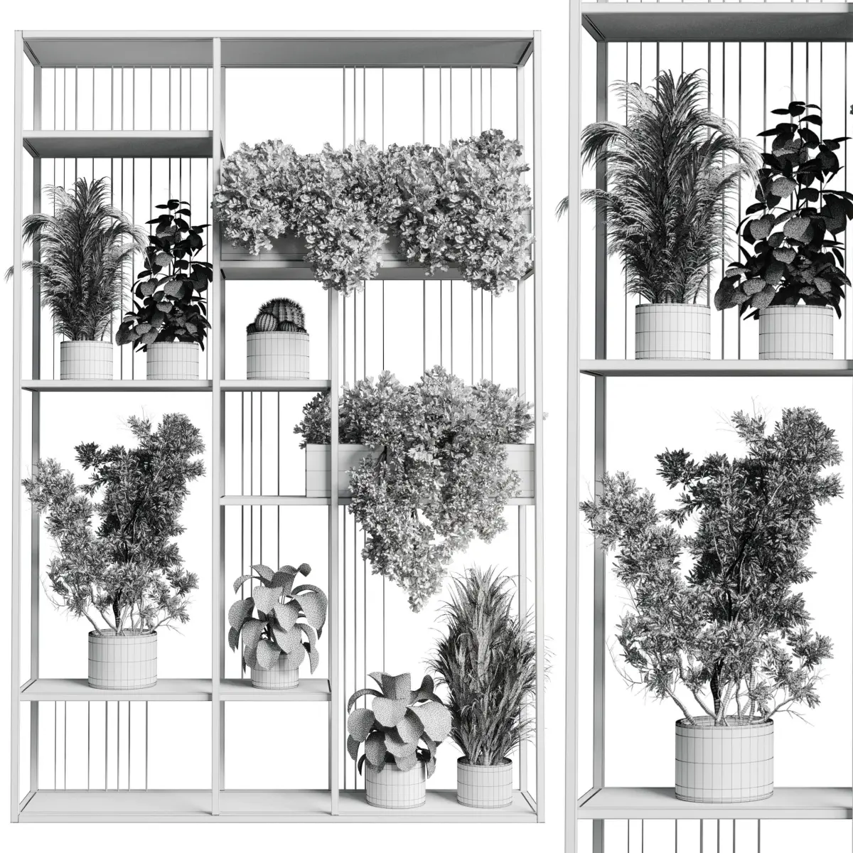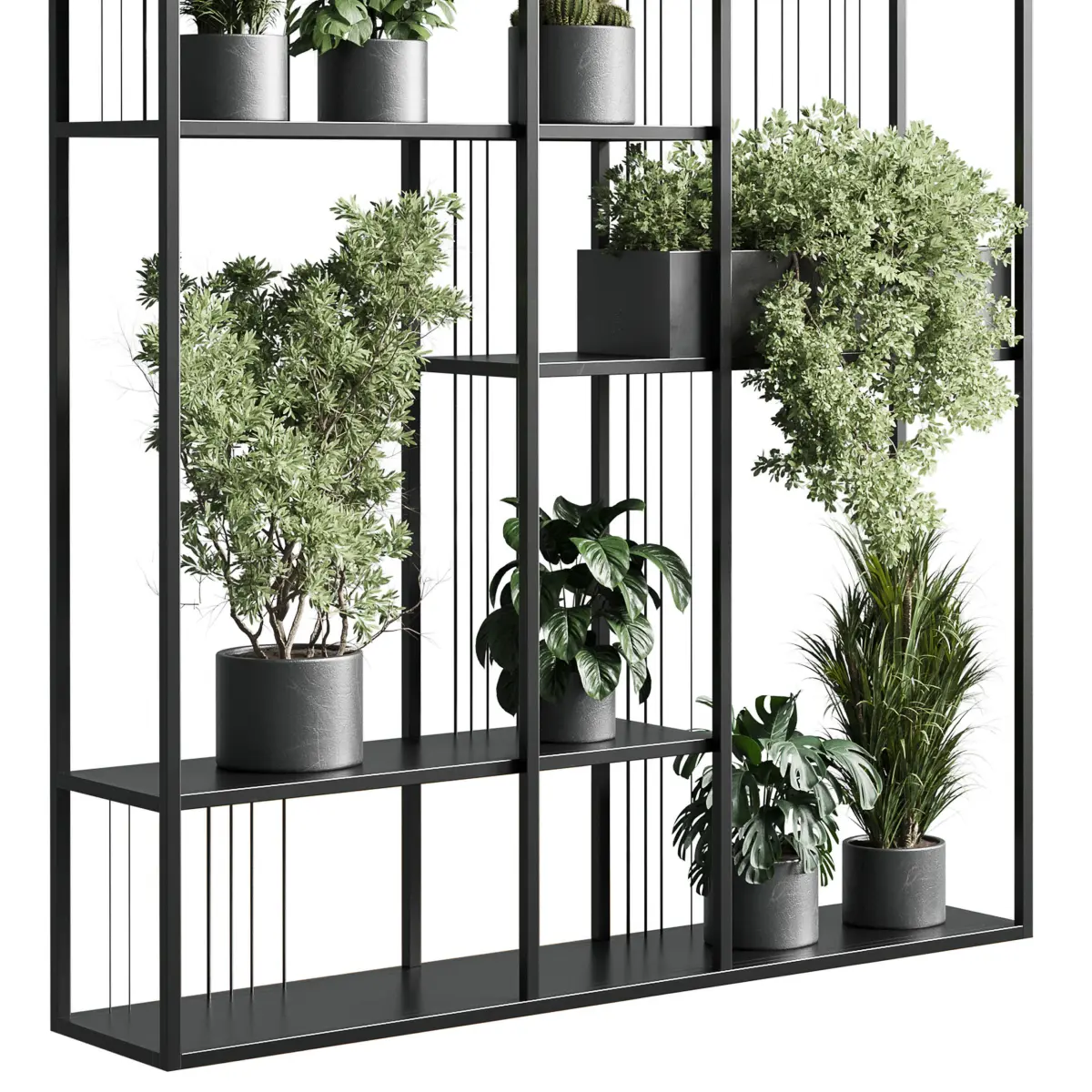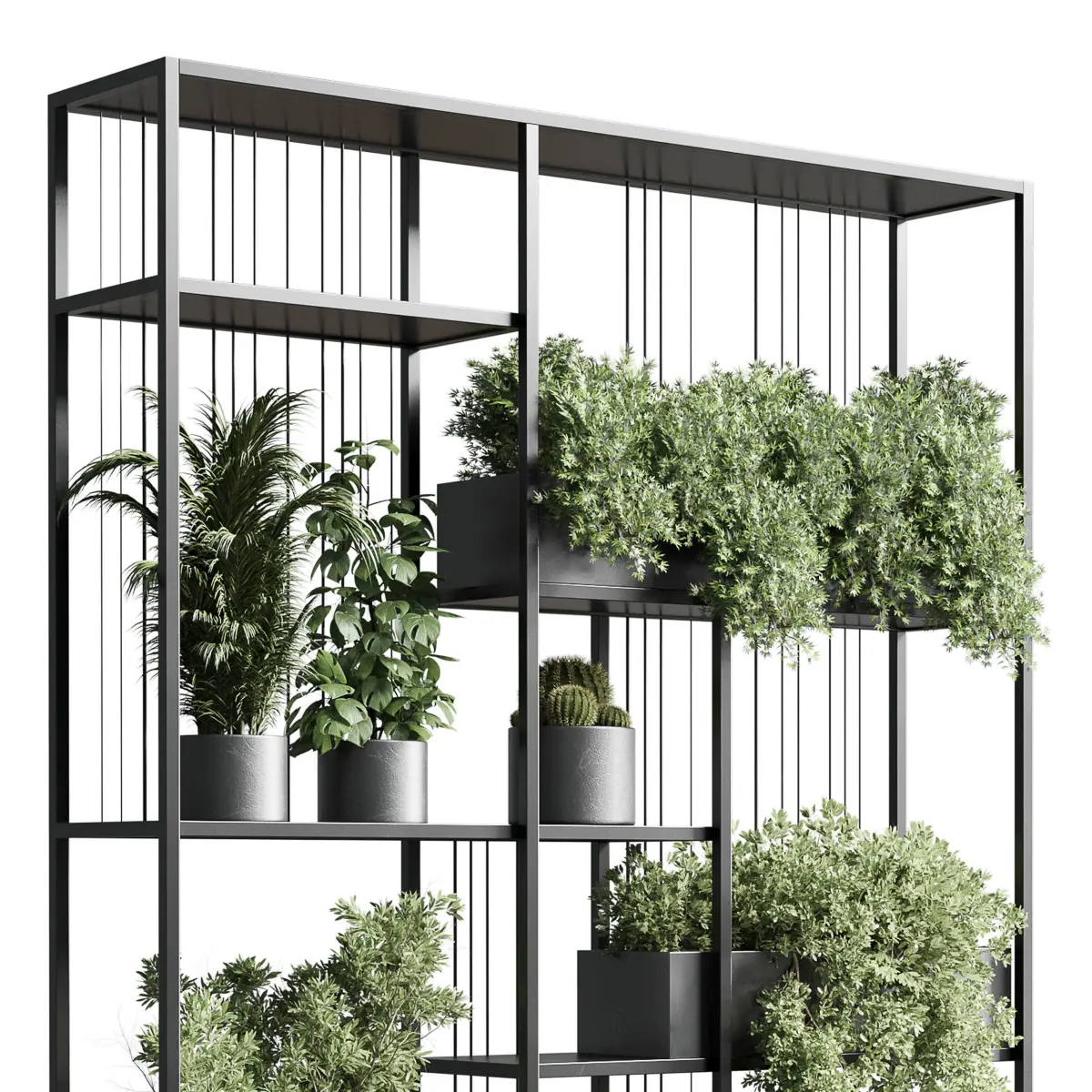 Standing metal shelf with a set of plants in concrete and metal boxes 325Platform: 3dsMax 2015 + obj fbxRender: Vray+CoronaStyle: ModernMaterials: Metal, Organics