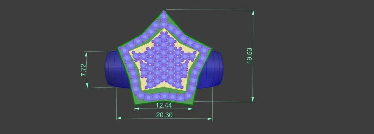 Size 11 star shaped diamond ring for your enjoyment. Features sixty one 1.5mm round stones and six 1.3mm round stones. All other dimensions are in the last two pictures.