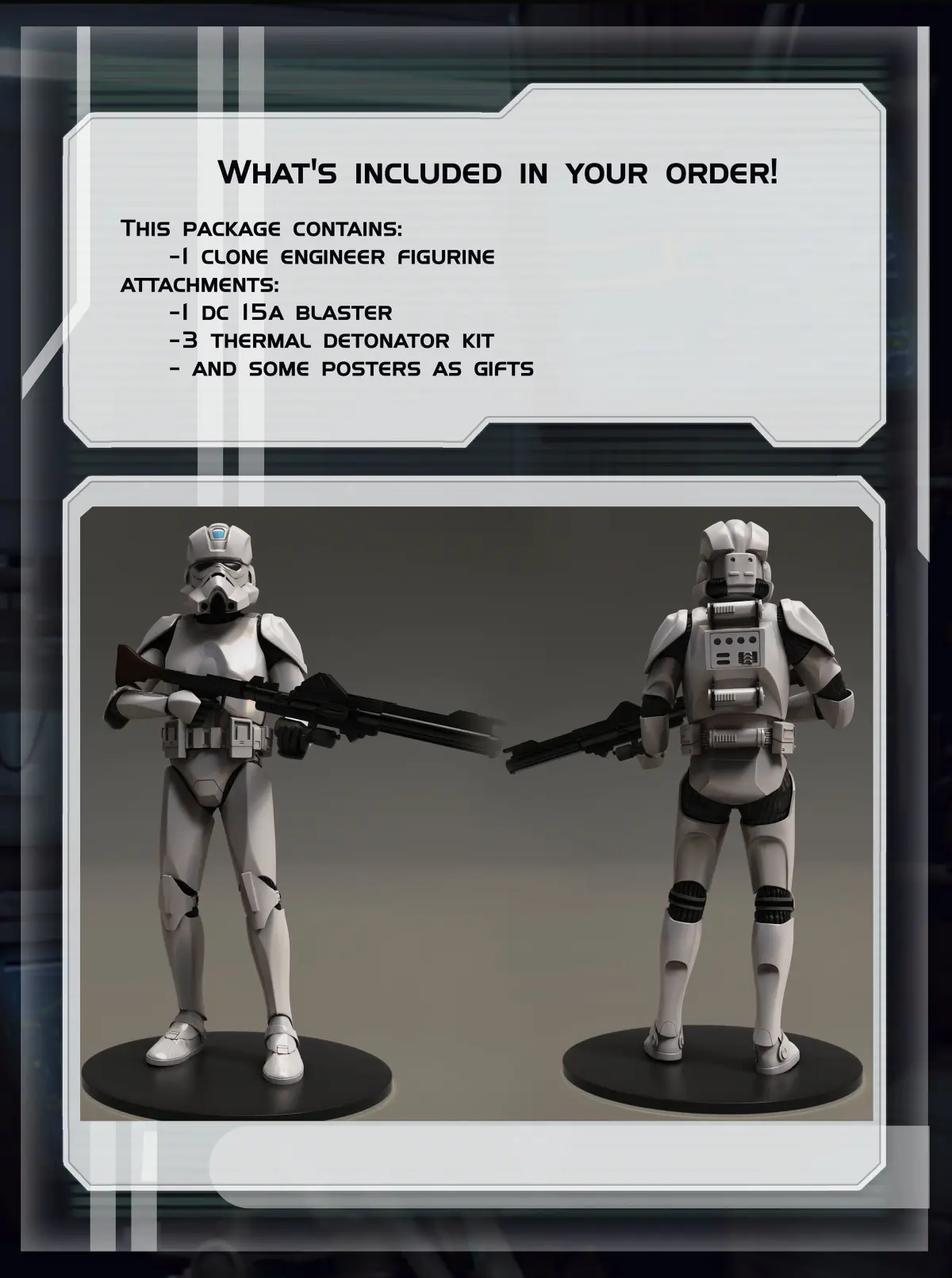 The clone engineers, also known as clone combat engineers, were members of special Combat Engineer Battalions in the Grand Army of the Republic that were well versed in a range of engineering techniques, from repairing vehicles to performing demolitions work.