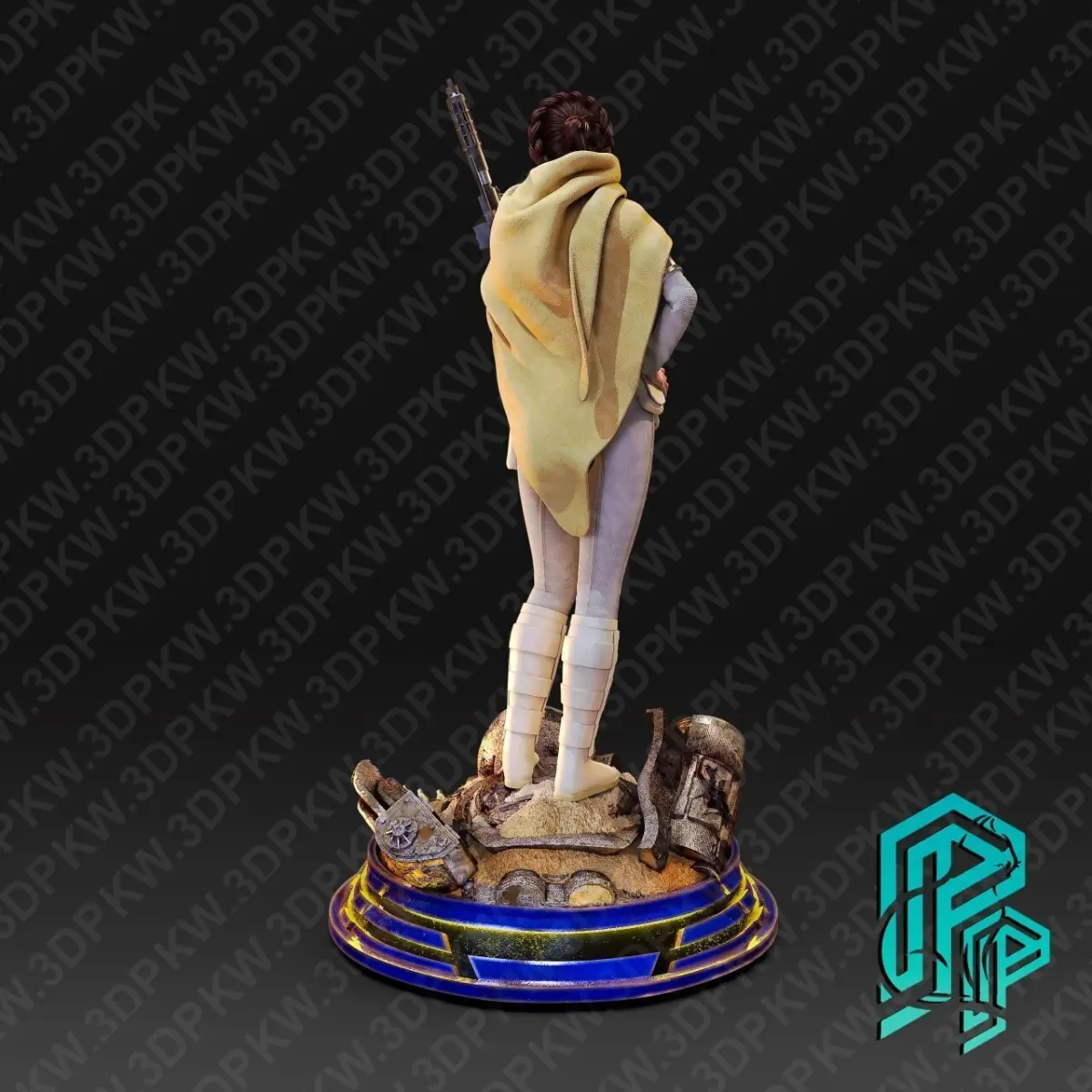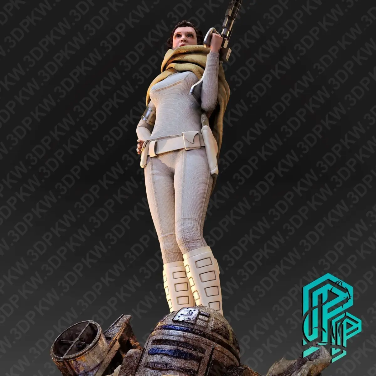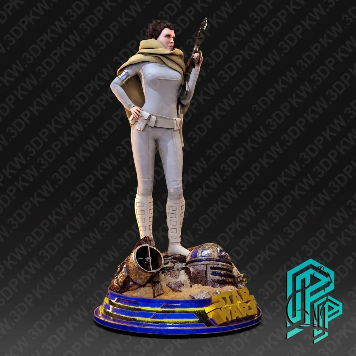 Bring the epic Star Wars universe to life with this highly detailed 3D model of Princess Leia Organa! Captured in a heroic pose, Leia is depicted with her iconic white combat suit and blaster. She stands atop a themed diorama base featuring detailed debris, including the legendary R2-D2 and other tech elements from the Star Wars universe. The front of the base showcases a bold 3D Star Wars logo for maximum visual impact.