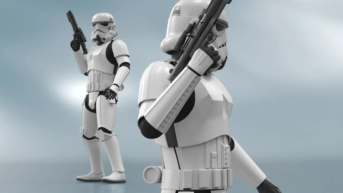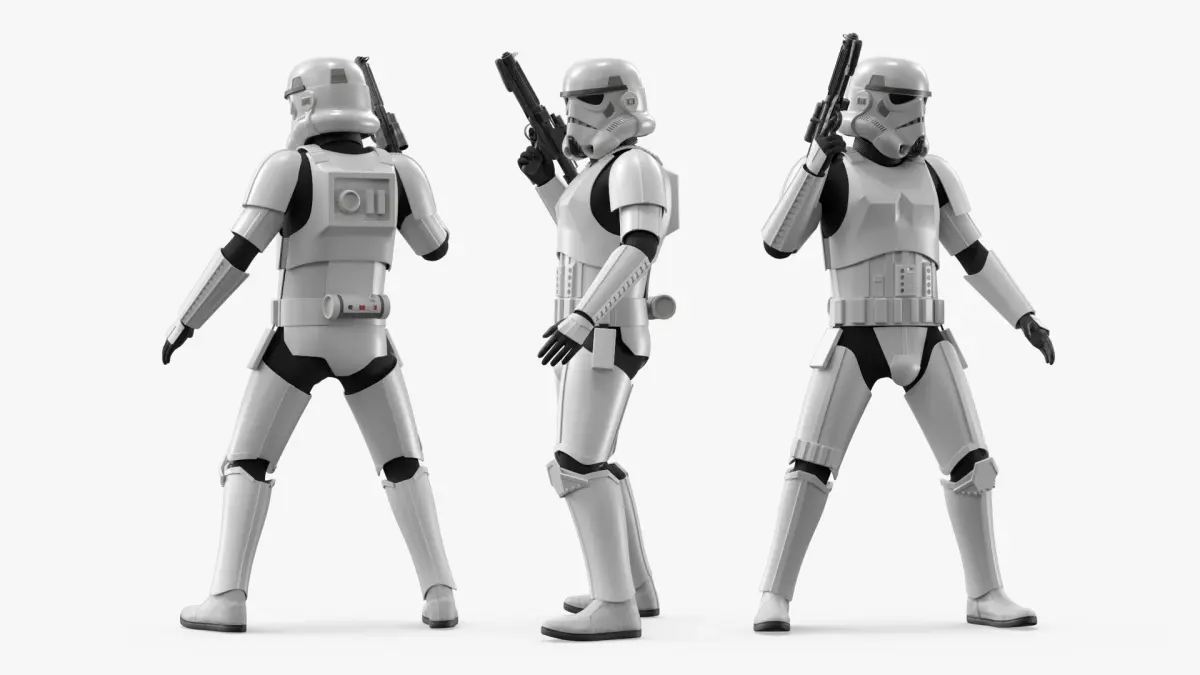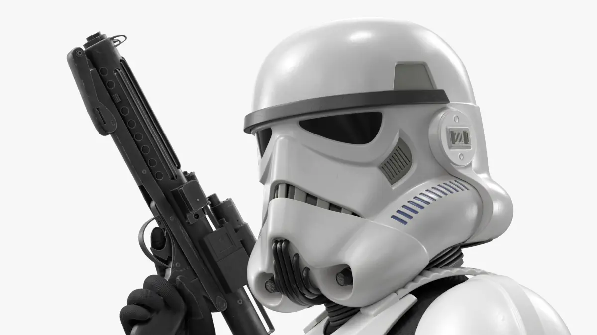 Star Wars Imperial Stormtrooper Raised Blaster Combat Pose is a three-dimensional model of Star Wars Imperial stormtrooper character in the futuristic military uniform, recognized for its sleek design and functional features, popular in sci-fi narratives.
