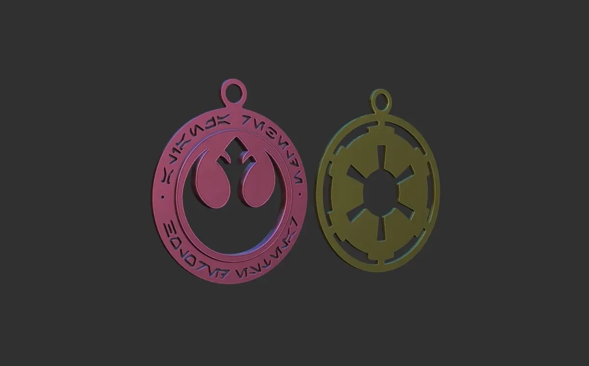 two pendants ready for 3d printing with the rebel and galactic empire symbol