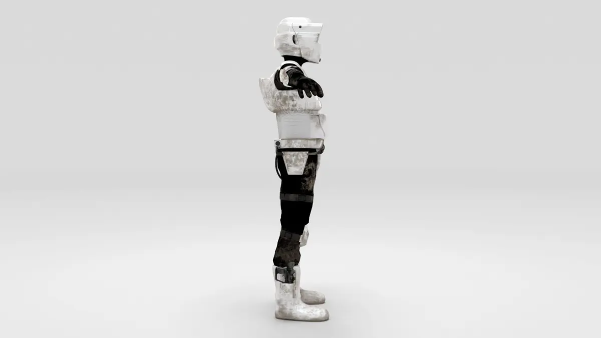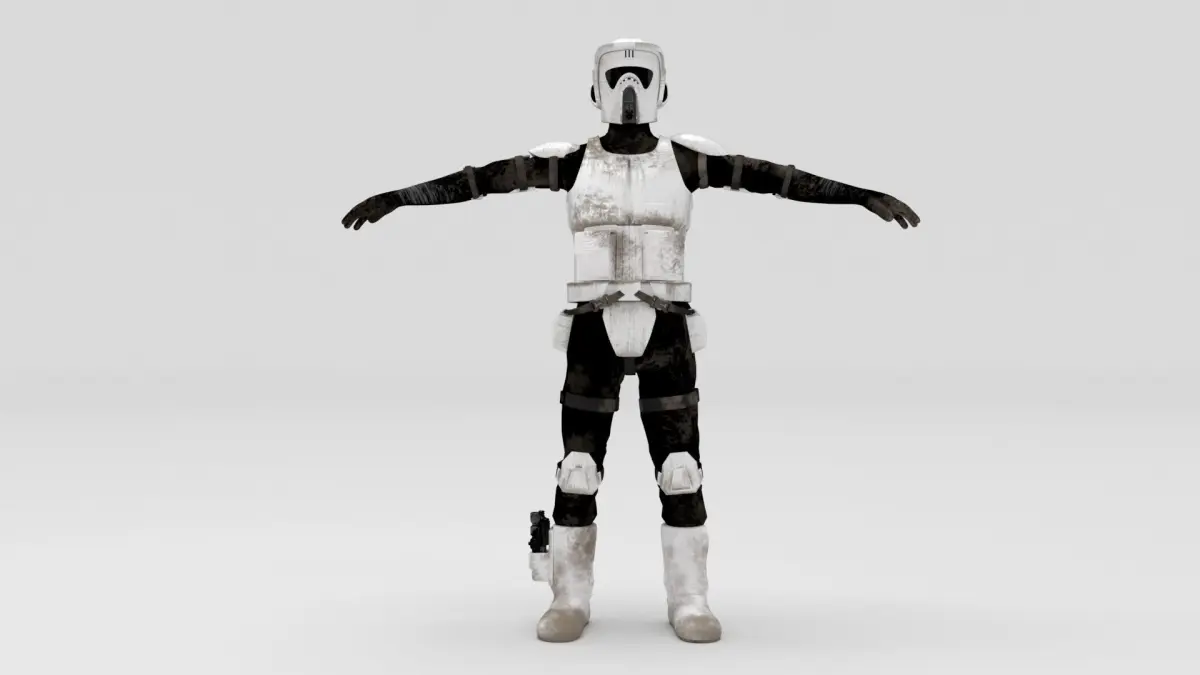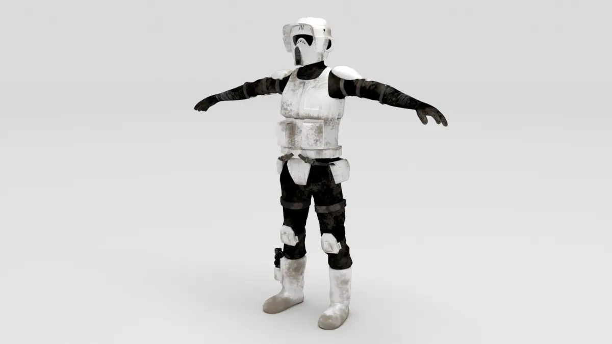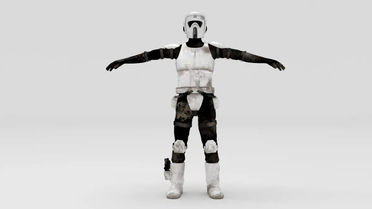 Scout Trooper model from Star Wars, includes one 3D model and two sets of HD textures versions, all textures are PBR.Scout Trooper is also in the set with speeder bike, check out my other models.