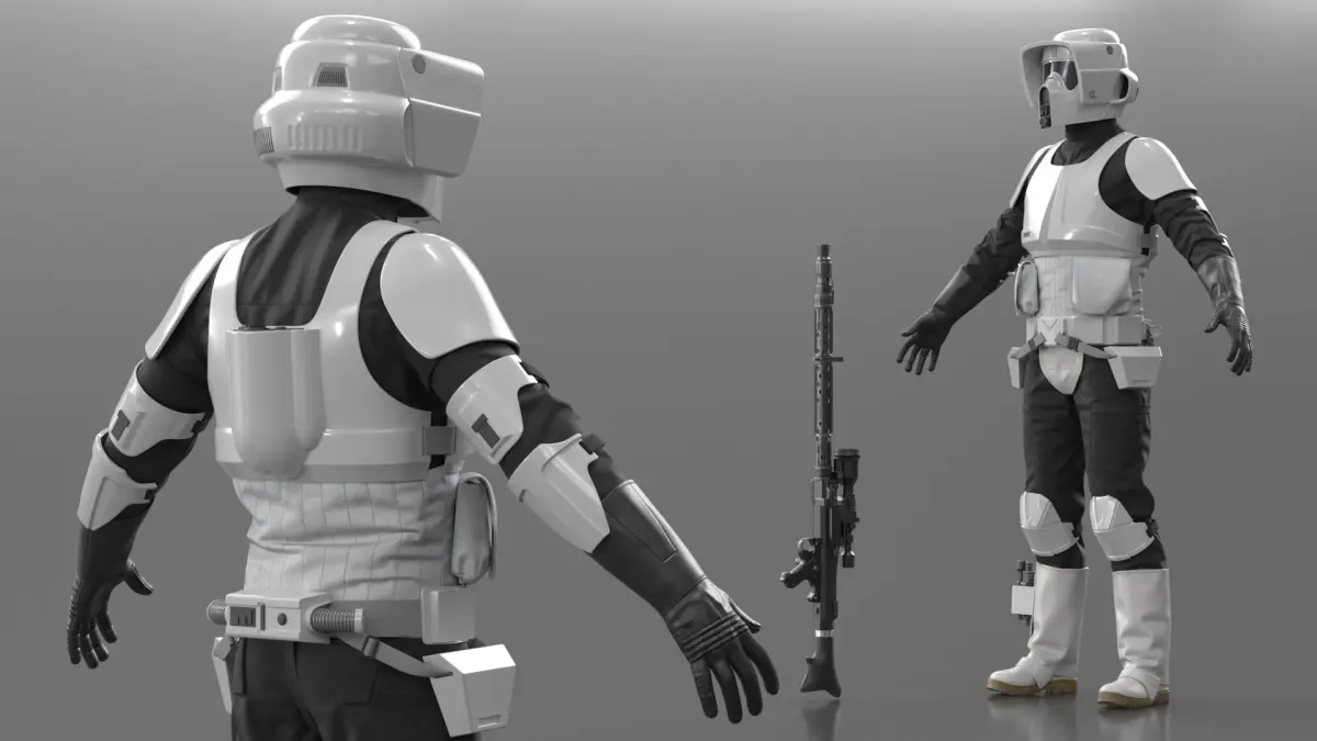 Star Wars Scout Trooper Armor with DLT-19X Blaster is a three-dimensional model of futuristic military uniform, recognized for its sleek design and functional features, popular in sci-fi narratives.
