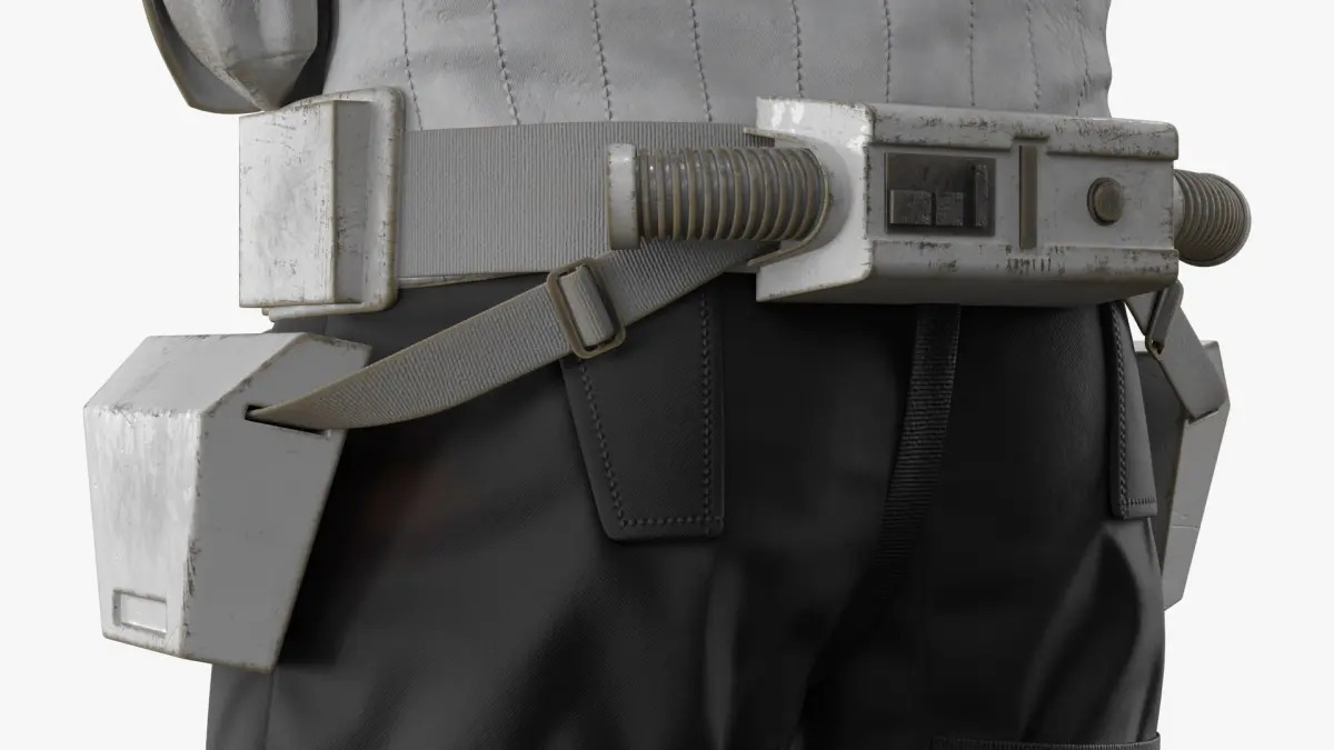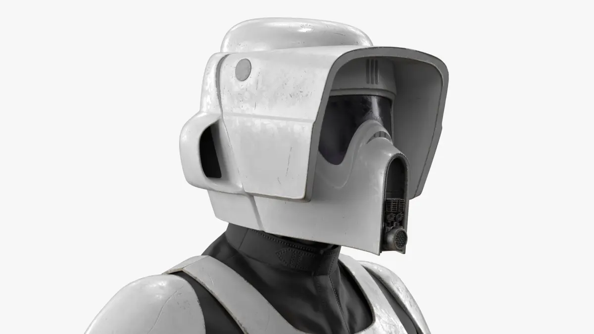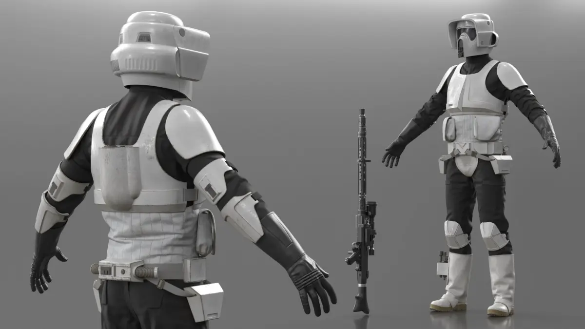 Star Wars Trooper Armor with Long Blaster Rifle Used is a three-dimensional model of futuristic military uniform, recognized for its sleek design and functional features, popular in sci-fi narratives.