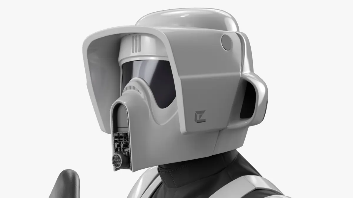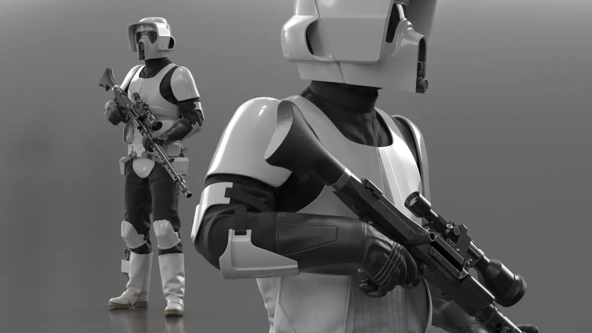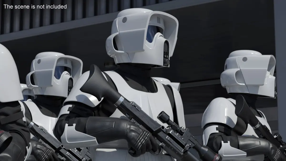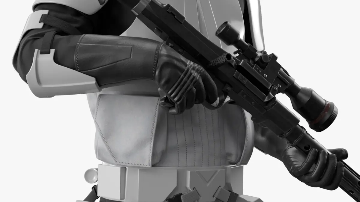 Star Wars White Trooper Loadout Standing Guard Position is a three-dimensional model of futuristic military uniform, recognized for its sleek design and functional features, popular in sci-fi narratives.
