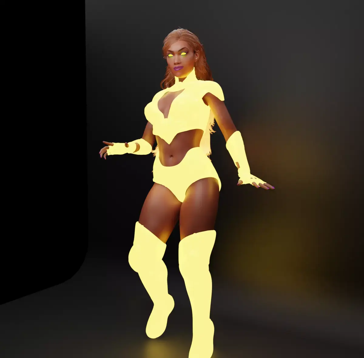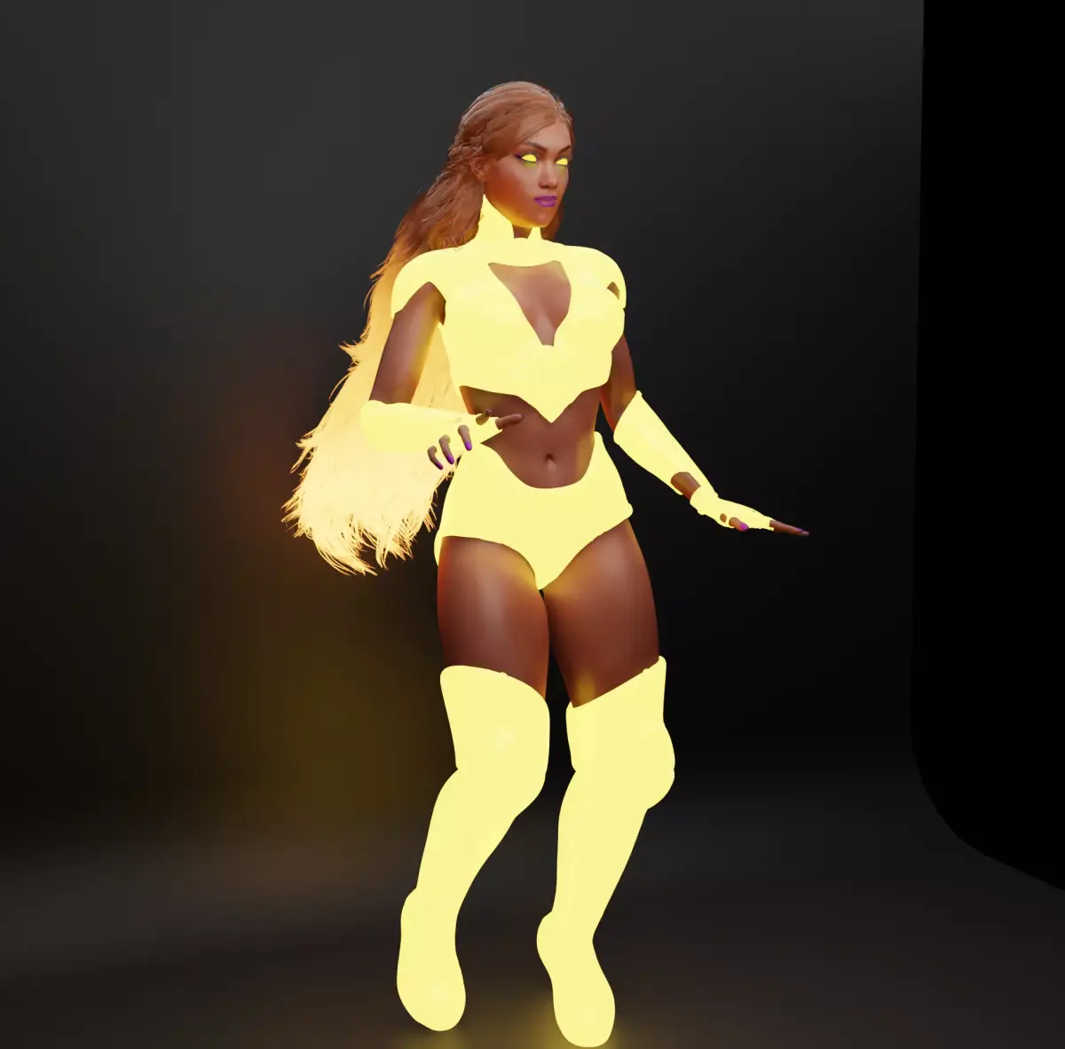 Star Woman is a dazzling intergalactic heroine, radiating cosmic energy and justice. Her sleek, form-fitting suit glimmers with stardust patterns, accented by glowing golden lines tracing across her armor. A luminous star emblem shines proudly on her chest, symbolizing hope and courage. Her flowing cape shimmers like the night sky, constantly shifting with constellations. Wielding the power of light, she can unleash brilliant energy blasts, create force shields, and soar faster than a comet, defending the galaxy from the forces of darkness.