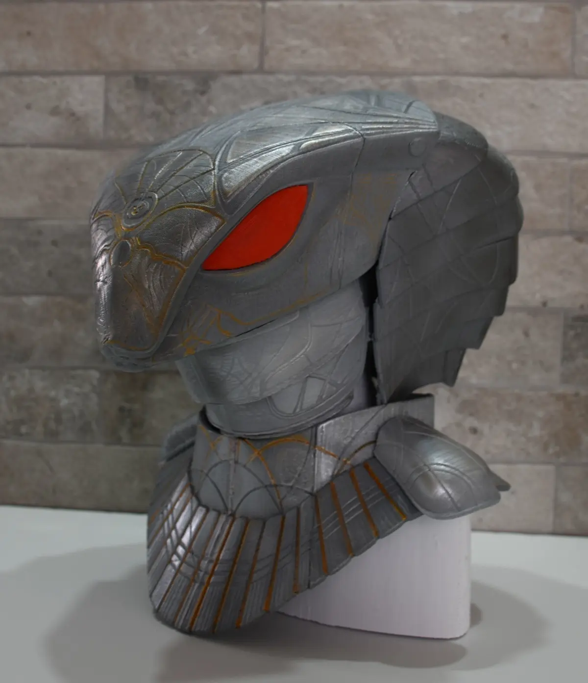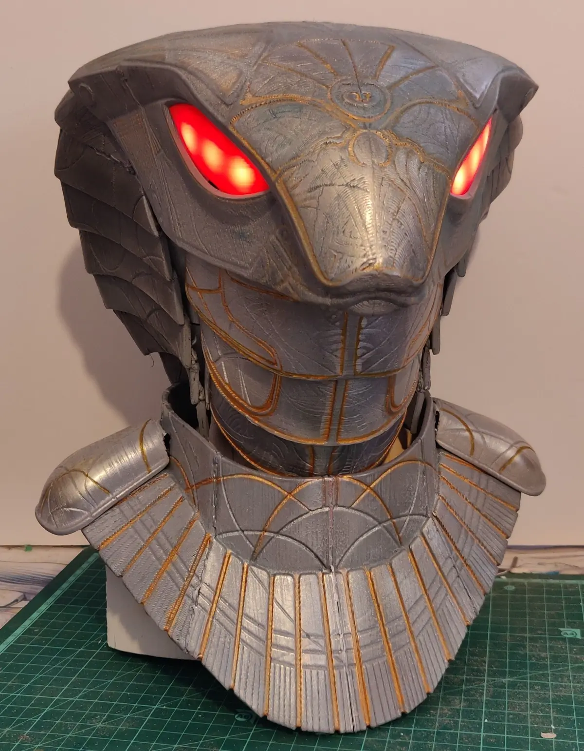 The eyes are printed straight up on red PLA, i then removed the back of the piece and connected led diodes.connecters.stl should help connect and align the head piece to the cowl and faceplate
