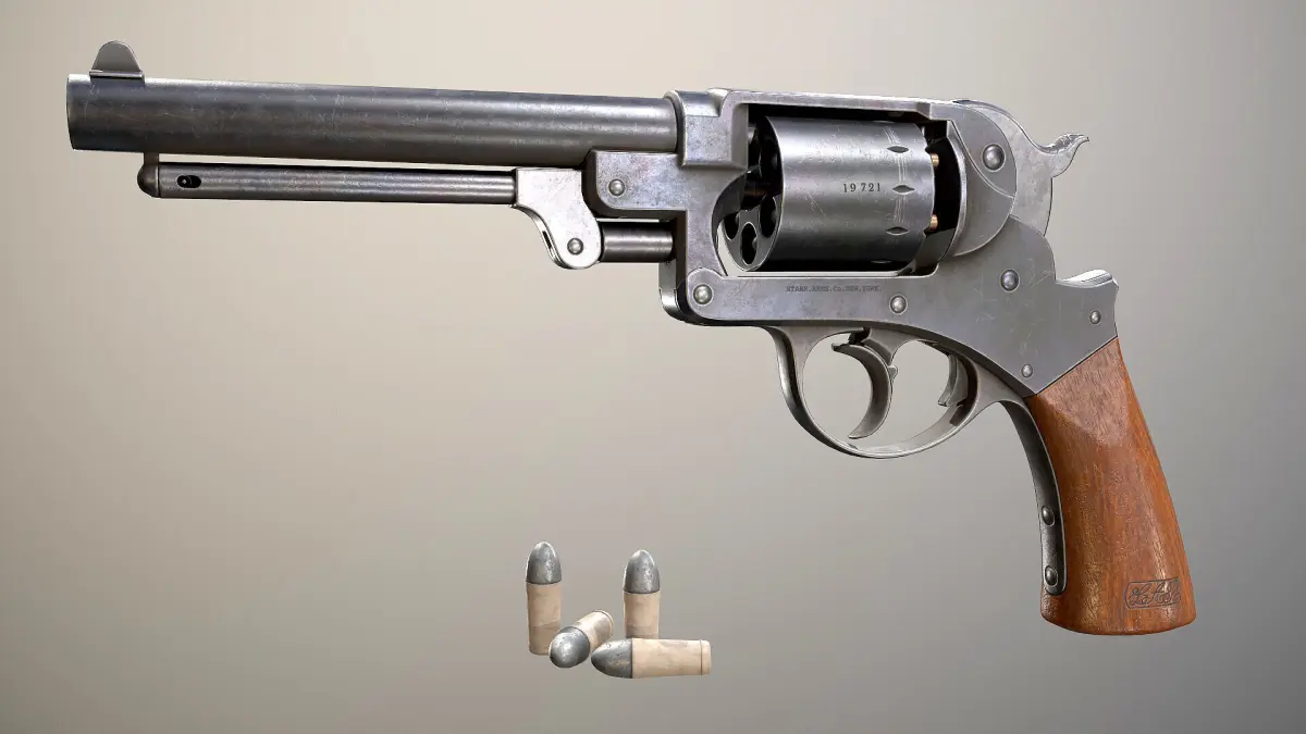 A Starr revolver (Starr DA) is a double-action revolver which was used in the western theater of the American Civil War until the United States Army Ordnance Department persuaded the Starr Arms Co. to create a single-action variant after discontinuation of the Colt. Low poly game ready model PBR metallic roughness16k tris