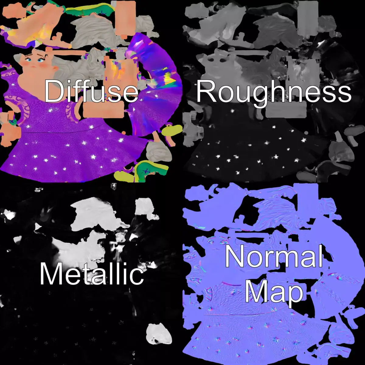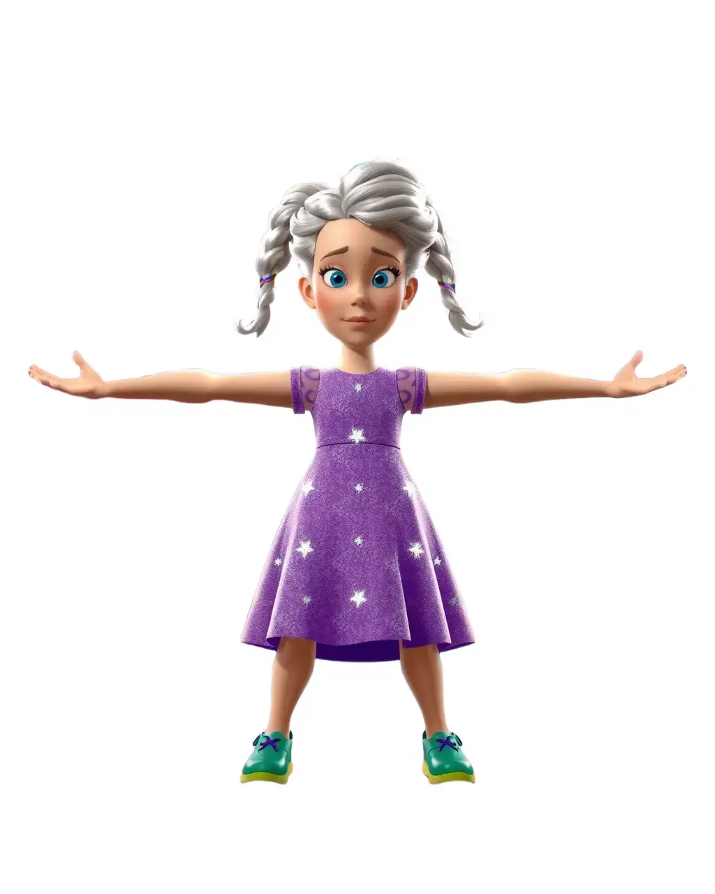 This delightful 3D model features a charming character with braided hair and a whimsical purple dress adorned with stars. Each model has 3 levels of detail: low-poly(1000 triangles for mobile), middle-poly(10 000 triangles for environment), and high-poly(100 000 triangles), which allows for the use of this model in production rendering(such as 3ds Max, Maya, Cinema4D, Blender, Vray/Corona/Cycles and all others), game engines(Unity and Unreal compatible), and interactive presentations, providing a choice of detail based on the LOD System principle. Perfect for animated films, children's games, or interactive stories. The model's textures are PBR, Diffuse, NormalMap, and reflection/roughness/metallic, which are suitable for any modern rendering engine. All models accurately unwrapped and have no overlapping UV. All textures are 4096*4096 in size. Like and comment if you enjoyed this model!