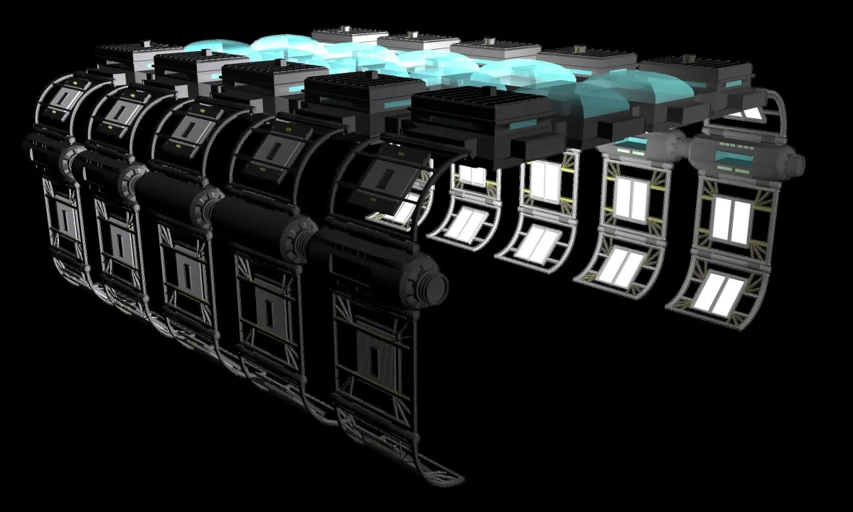 The pods on the top are either solar arrays or dome features and you can adjust them via the materials list of over 20 different materials.The pic of the top of the drydock depicts a full size, service access door to the solar aray surface to give you an idea of scale.There are also viewing windows located on each of the 4 sides of the pods. The two similar pics show the pod dome set at 100% opacity and again at 60% opacity.Add your own office, forest, garden or trading bazar interiors.