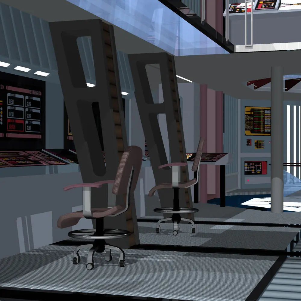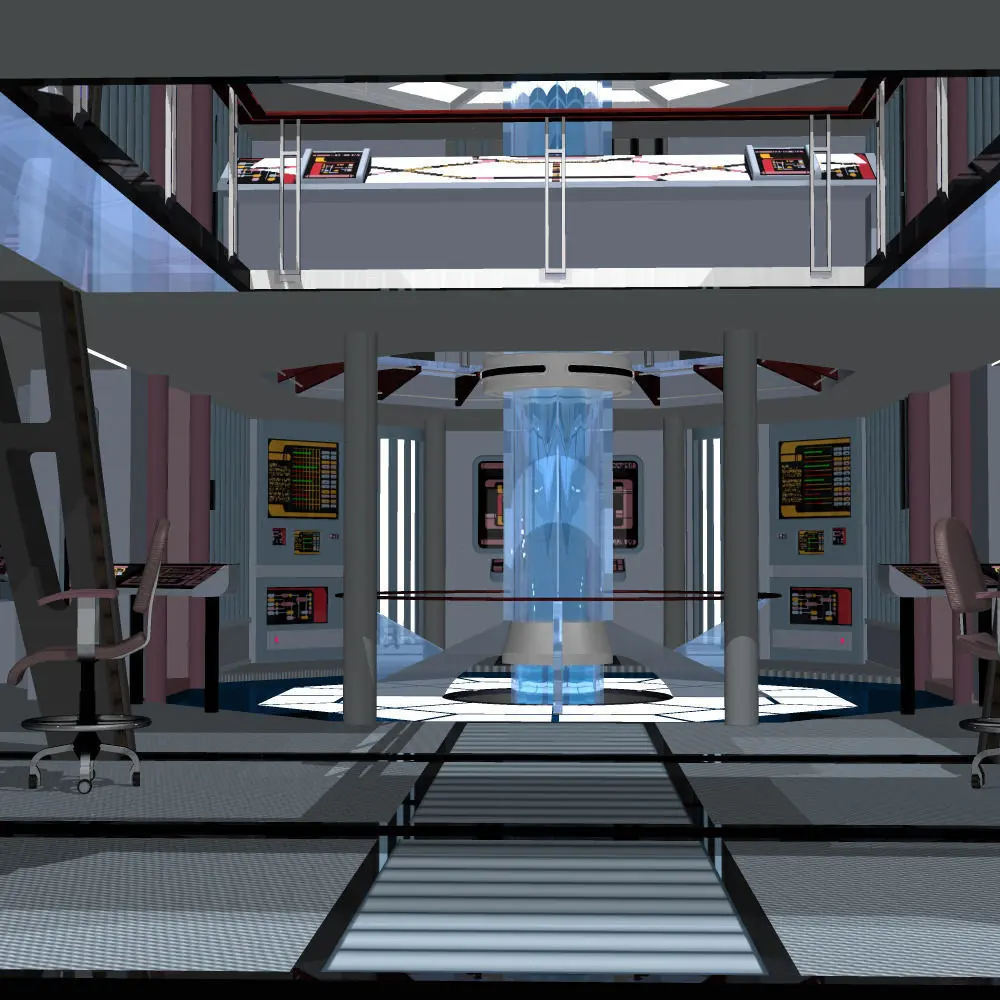 This room is a more advanced engineering room for a more advanced starship. The two-story design allows the various ship functions to be monitored from the side stations, side rooms, or even from the stations on the second level.