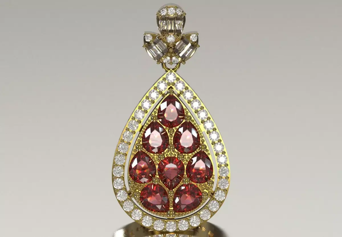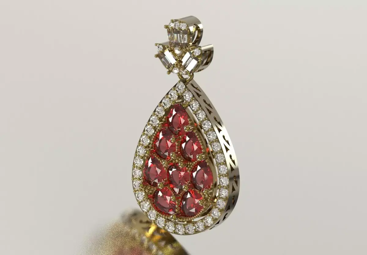 JP0398 Pendant: Statement Pear Drop Pendant with Cluster Rubies/Garnets, a symbol of concentrated luxury, tears of passion, and dramatic sparkleThe JP0398 Pendant is a Cluster Setting Statement Pendant with a classic pear-shaped design and crown-like embellishments. This design focuses on a dense arrangement of pear and round red stones in the center and wide diamond bezel, providing an incredibly magnificent, bold and dramatic effect.