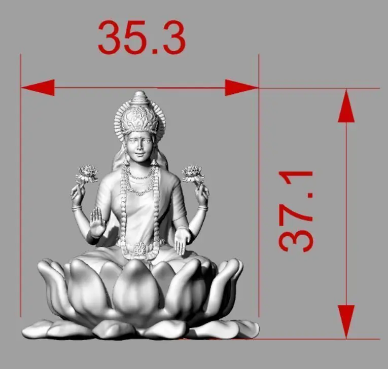 Statue of Goddess Lakshmi 3D print model can be 3D printed and can be casted in any material. The file cointains STL models. the weight -47 gram-silver and the size is 37mm x 35mm. For any additional information or request like editing or if you have trouble downloading contact me. I'll be glad to help as soon as i can. The model is made in full compliance with the technical requirements for production.