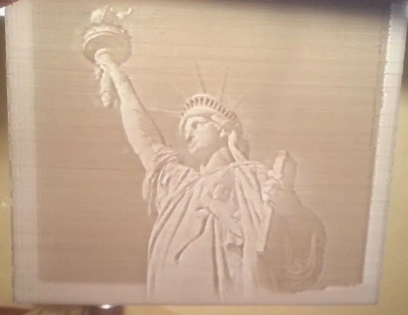 The one in the picture is printed upright on an Up Plus (0.15 mm layers) in white PLA. If you view the printed picture in the light you can see the image appear.