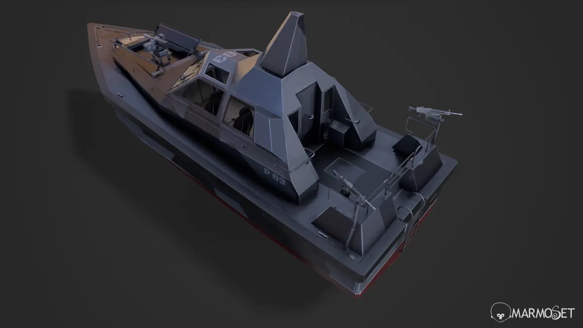 Textures: -boat texture 4096*4096 (albedo, gloss, specular, normal) -interior 2048*2048 (albedo, gloss, specular, normal) -weapons (2 x M249 SAW and MK-19 grenade launcer) texture 4096*4096 (albedo, gloss, specular, normal) - glass 1024*1024 (albedo, gloss, specular, normal) - added metalness-roughtness + AO texture set - added specular-gloss + AO texture set